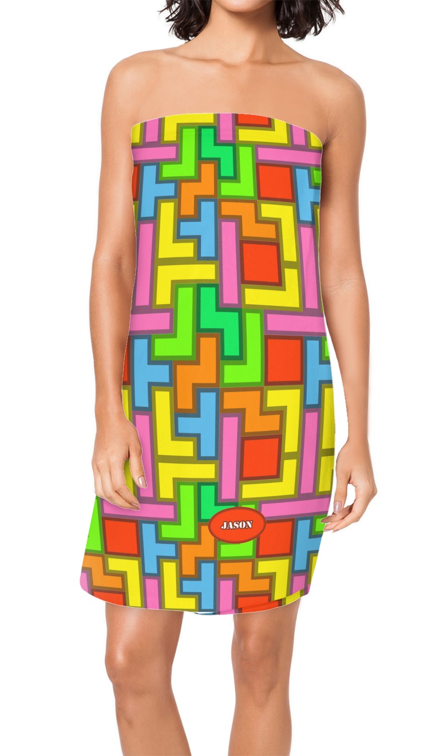 Made from a plush, fleece fabric, these luxurious towel wraps are comfortable and absorbent. They are printed, cut, and sewn for you, right here in the USA, after you place your order. These personalized bath wraps measure at approximately 59 by 32 inches, and display your customization across the outside.