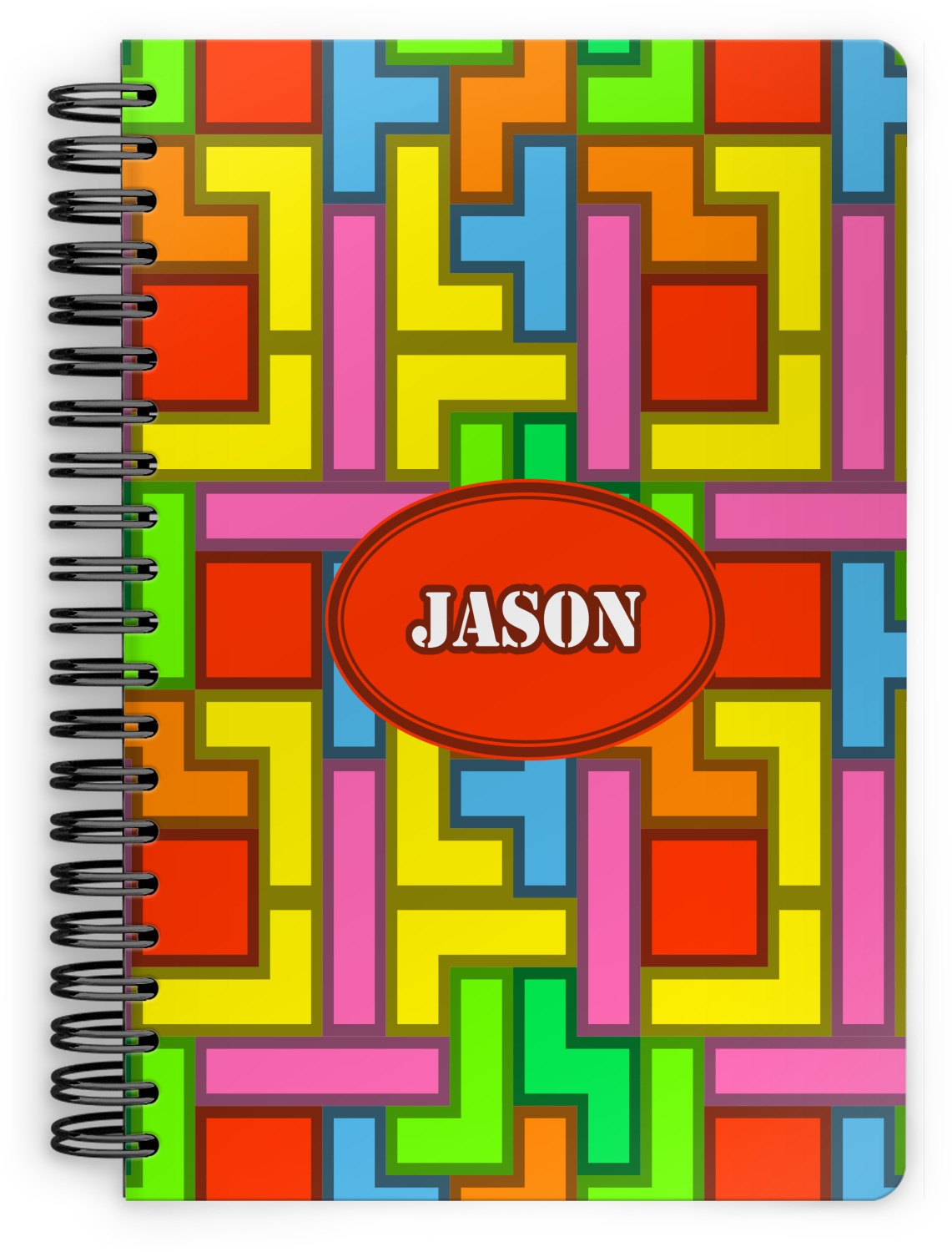 The tetromino print offers all the classic colors and shapes to delight a true gamer. A big oval label breaks up the pattern and highlights the personalization of your choice.