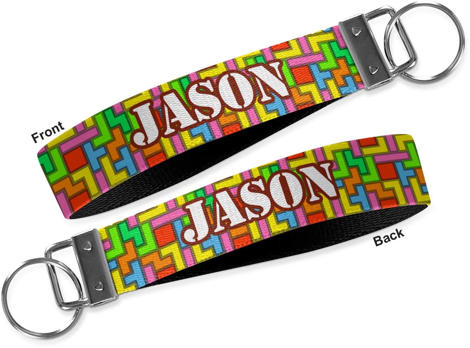 These key fob keychains are made from a polyester weave, right here in the USA. They feature a silver, metal clasp, attached to a round keyring. The piece gives the personalized wristlet a beautiful, finished look. Your customized design is printed on the outside of the keychain strap. We carry these wristlets in two sizes: small, which is 5 inches in width, and large, which is 5.5 inches in width.