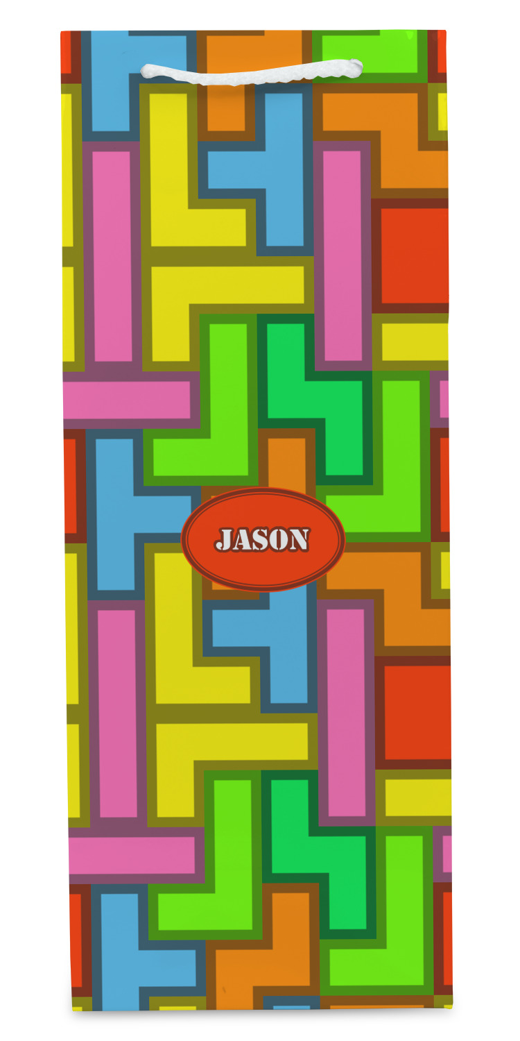 The tetromino print offers all the classic colors and shapes to delight a true gamer. A big oval label breaks up the pattern and highlights the personalization of your choice.