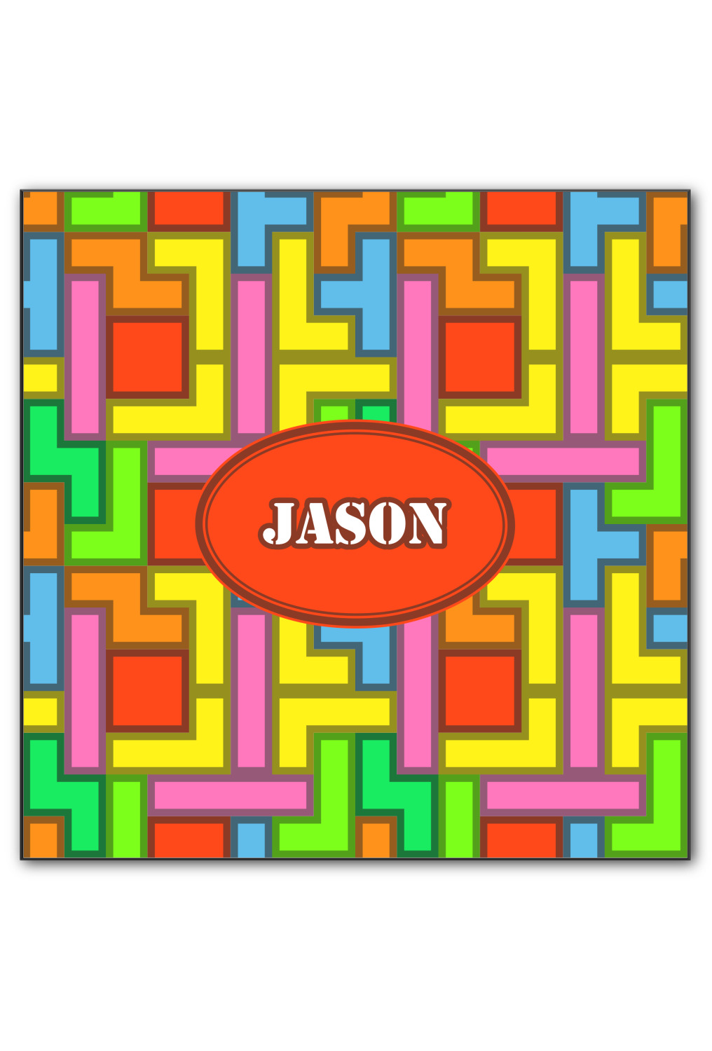 The tetromino print offers all the classic colors and shapes to delight a true gamer. A big oval label breaks up the pattern and highlights the personalization of your choice.