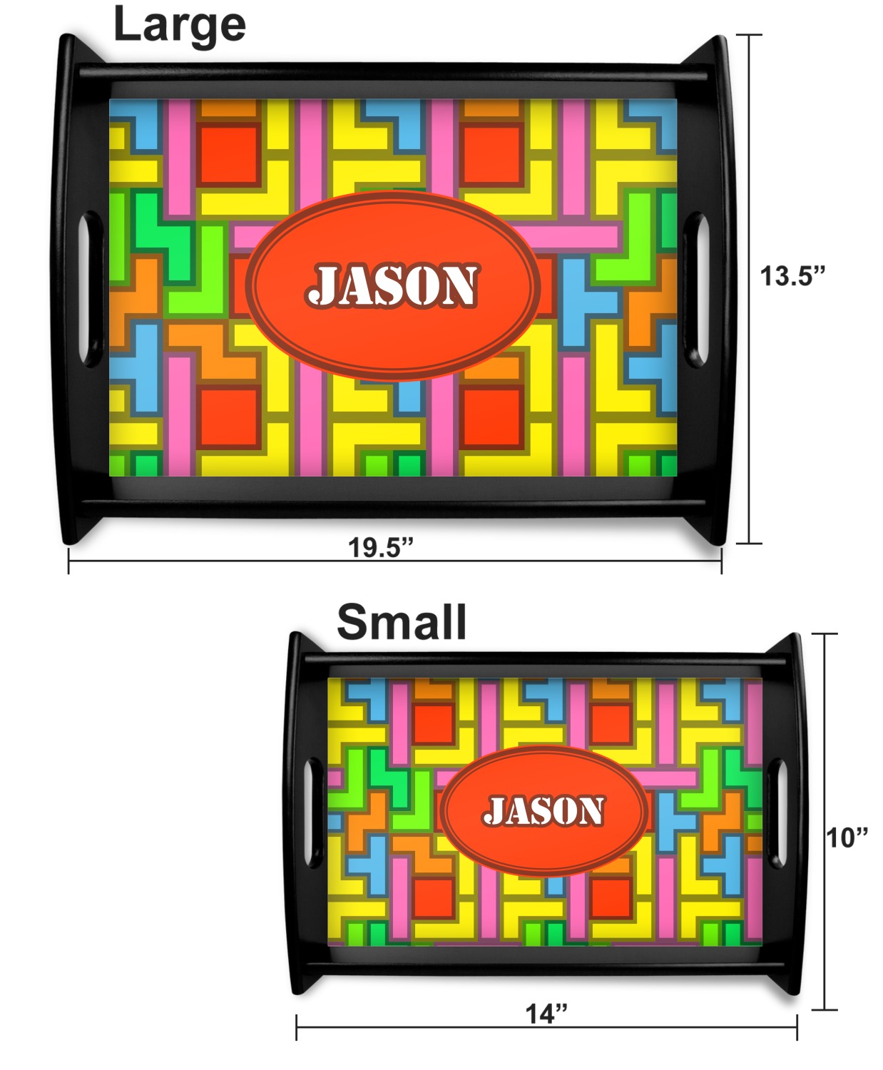This serving tray with handles features square edges and two rounded sides, creating a very modern look. Each side is fabricated from a beautifully cut, natural wood. The bottom of the interior of the tray displays your customized design in bright, vibrant color. The tray is sold in both a black color and a natural wood look. Each variation of the wood serving tray has two sizes: Small, which is 14" x 10" x 2.25", and Large, which is 19.5" x 13.5" x 2.75".