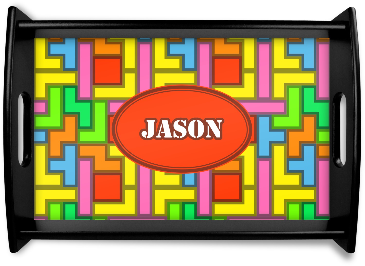 The tetromino print offers all the classic colors and shapes to delight a true gamer. A big oval label breaks up the pattern and highlights the personalization of your choice.