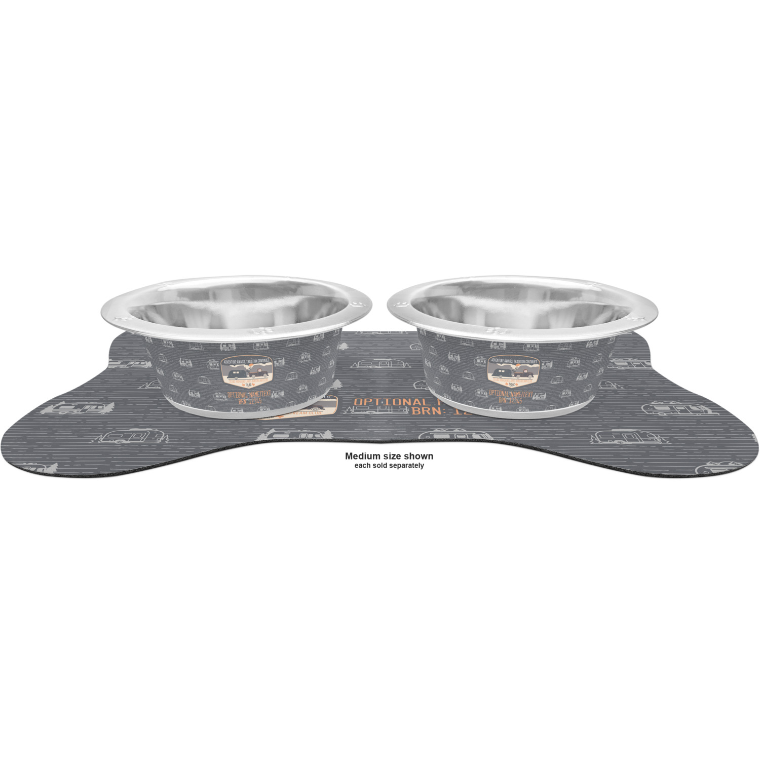 The top of this mat displays your custom design, as it is printed on polyester. To prevent slippage, the underside of the mat is made of rubber. We offer a small dog food mat, suitable for smaller dogs and a large dog food mat for bigger breeds. The small dog food mat is approximately 19 by 13 inches, while the large dog feeding mat measures at approximately 26.75 by 18 inches. Both personalized mats are ideally sized to fit two dog bowls.