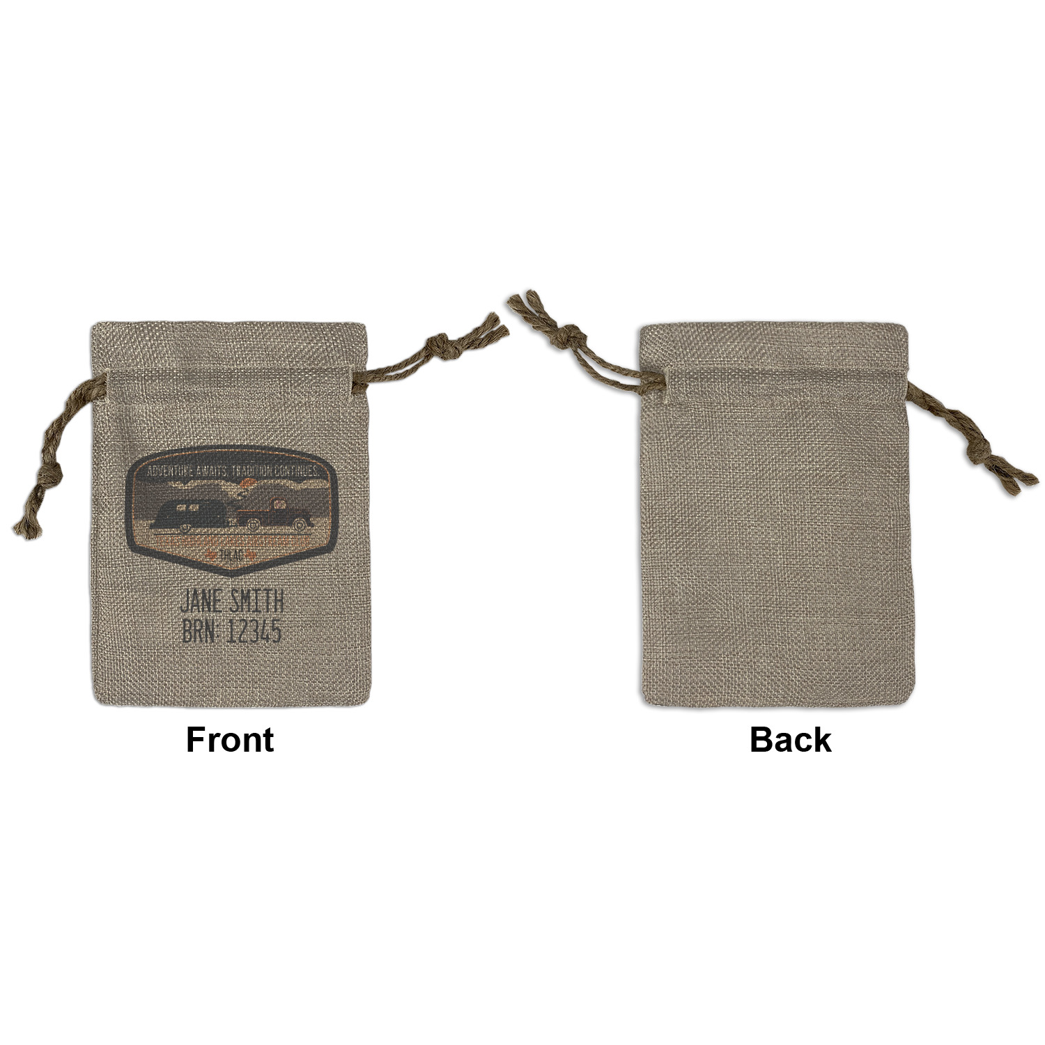 We sell our Burlap Gift Bags in 3 variant sized bags. Made with burlap polyester, each personalized bag can be secured with a twine drawstring pull. Your custom design is available to print on one side or both sides - completely up to you! The sizes of the bags measure approximately 4.5" x 6.5" for the smallest size, 6.5" x 8.0" for the medium size, and 6.5" x 13.5" for the large-sized bag.