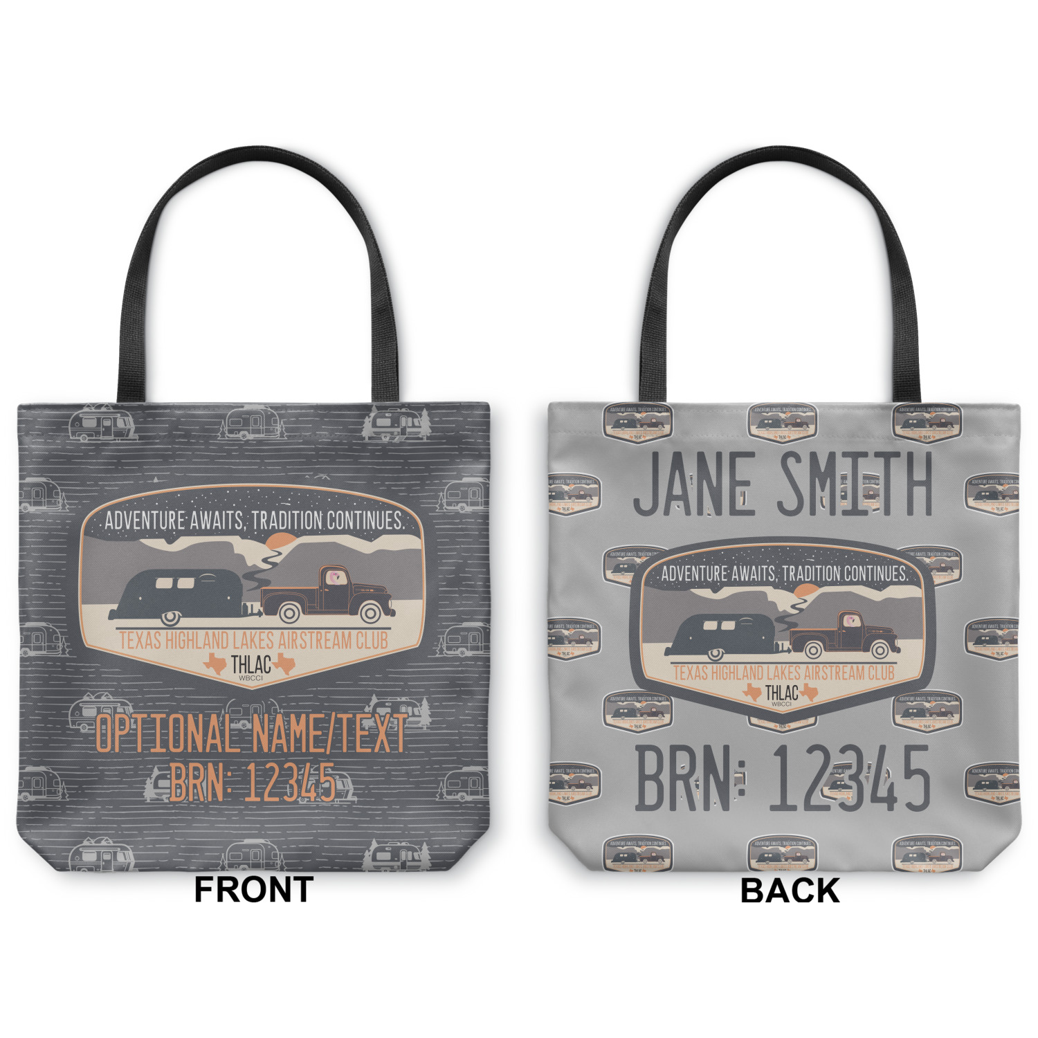 Our totes are made right here in the USA. Your design is printed on canvas fabric; the fabric is then cut and sewn on the sides and on the bottom to add an approximately 3.5 inch gusset. Black cotton handles are sewn in and reinforced. Your tote has a designs on both sides - the designs can be the same or different - the choice is yours. The inside of the tote has a black fused lining.
