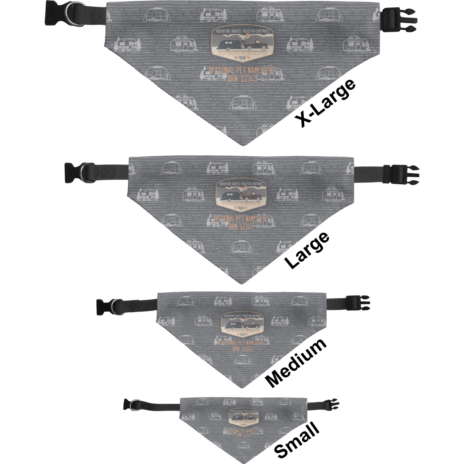 We print the front and back of these dog bandanas with your customized design. The bandana itself is made from a durable polyester, sewn together with a gap large enough to accommodate any collar. Regardless, the bandana includes a plain black, canvas collar with plastic snaps, that can easily be removed if desired. These dog bandana collars are available in four sizes: small, medium, large, and extra large. Please see our sizing chart for more information regarding the dimensions of each size.
