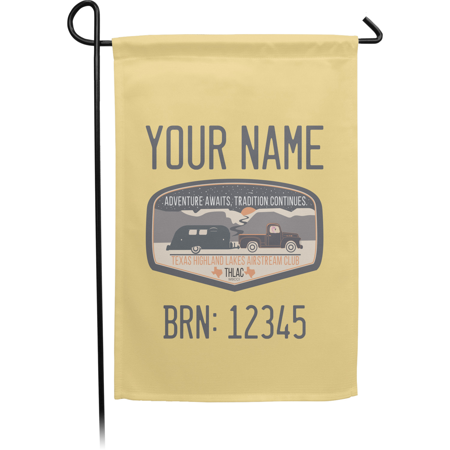 These custom garden flags are made of a durable, double-ply, polyester weave, allowing them to withstand the elements year round. The small flags measure at approximately 12 by 18 inches. The large flags measure out to 28 by 37 inches. You can order these decorative flags with your customization printed on the front only, or the front and back.