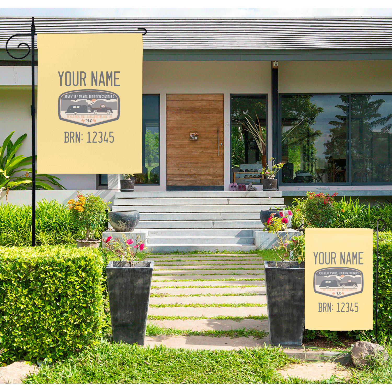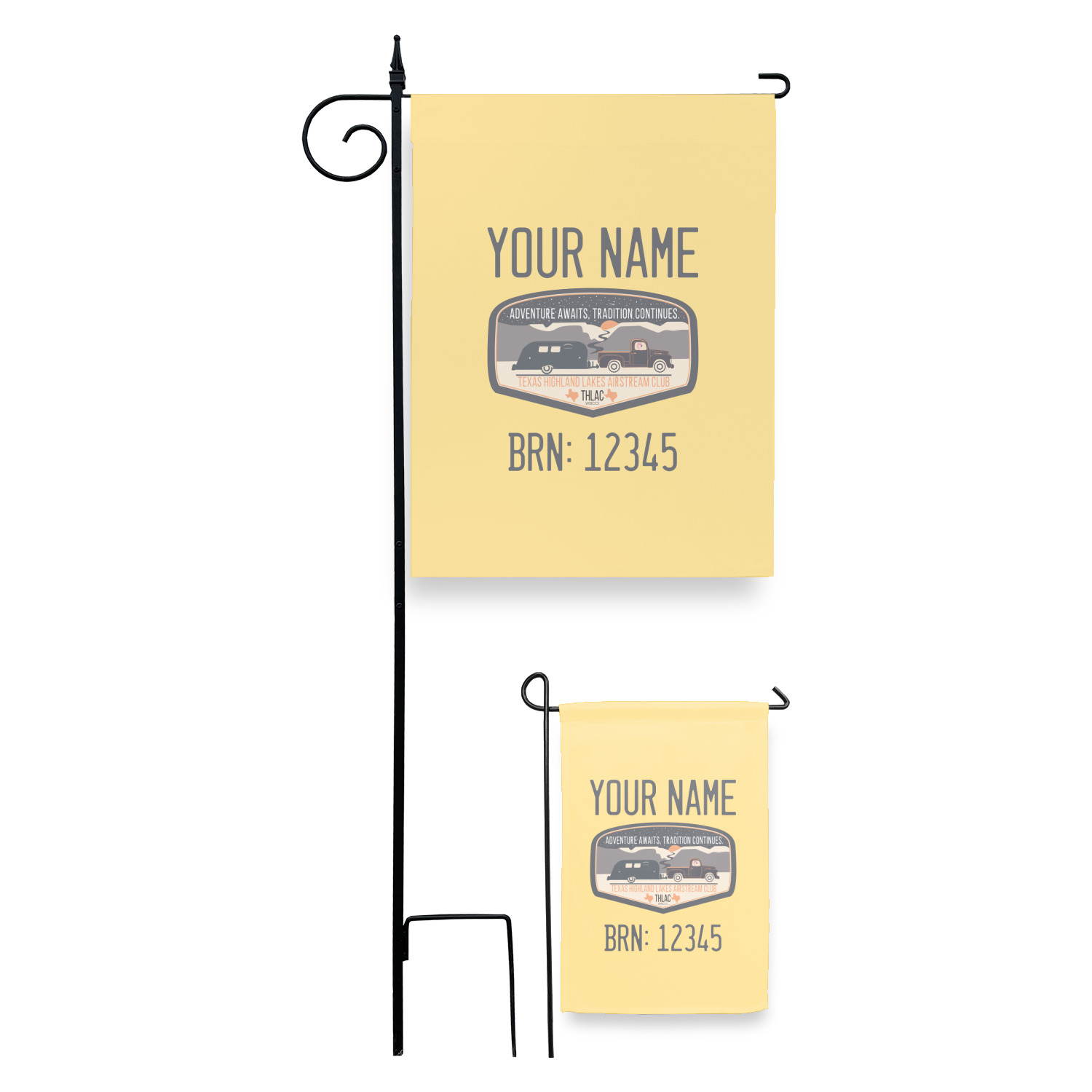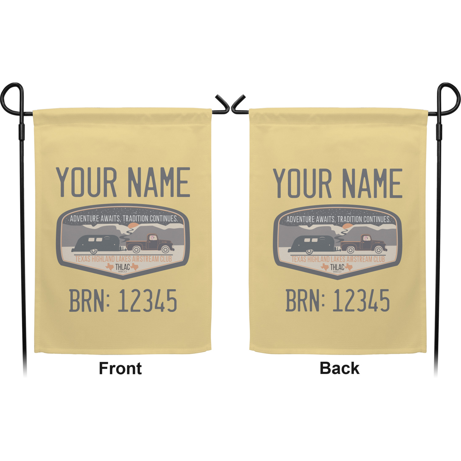These custom garden flags are made of a durable, double-ply, polyester weave, allowing them to withstand the elements year round. The small flags measure at approximately 12 by 18 inches. The large flags measure out to 28 by 37 inches. You can order these decorative flags with your customization printed on the front only, or the front and back.