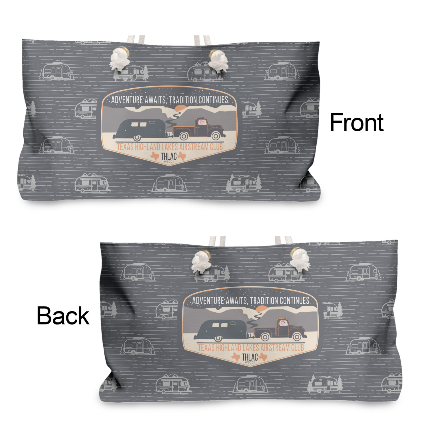 Our oversized weekender tote with rope handles is perfect for your weekend at the beach or on the town. This large tote are 24" W X 13" H, with a 5" gusset and a 27" thick rope handles with a knot that is put through a grommeted brass hole.