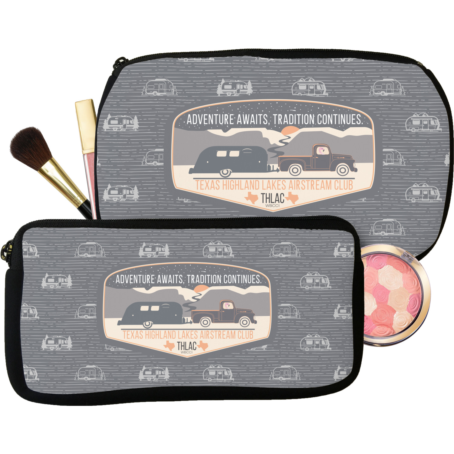 Our makeup bags are available in 2 sizes, small for smaller purses and less makeup, while the medium one for larger purses, as well as more makeup. Neither one of these is big enough for me when I am traveling - so, we do carry custom toiletry bags for travel.