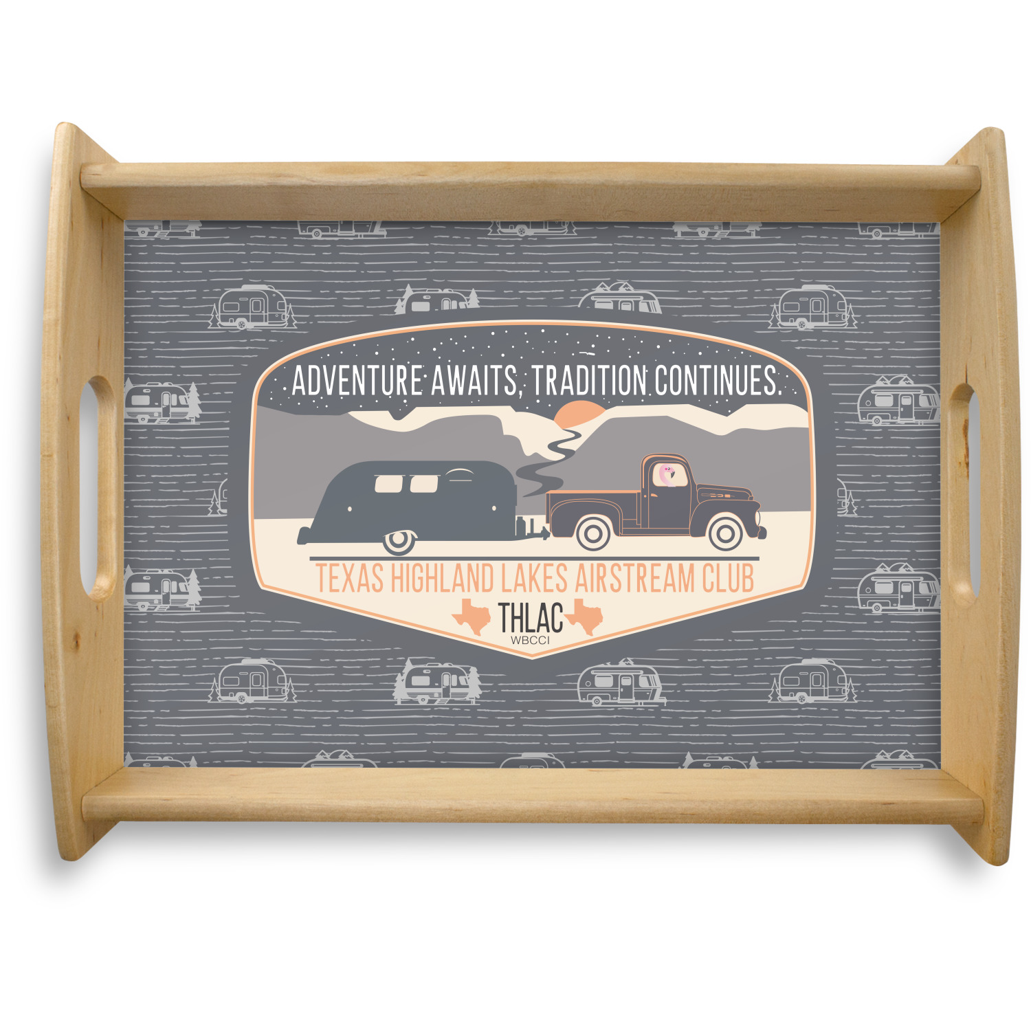 This serving tray with handles features square edges and two rounded sides, creating a very modern look. Each side is fabricated from a beautifully cut, natural wood. The bottom of the interior of the tray displays your customized design in bright, vibrant color. The tray is sold in both a black color and a natural wood look. Each variation of the wood serving tray has two sizes: Small, which is 14" x 10" x 2.25", and Large, which is 19.5" x 13.5" x 2.75".