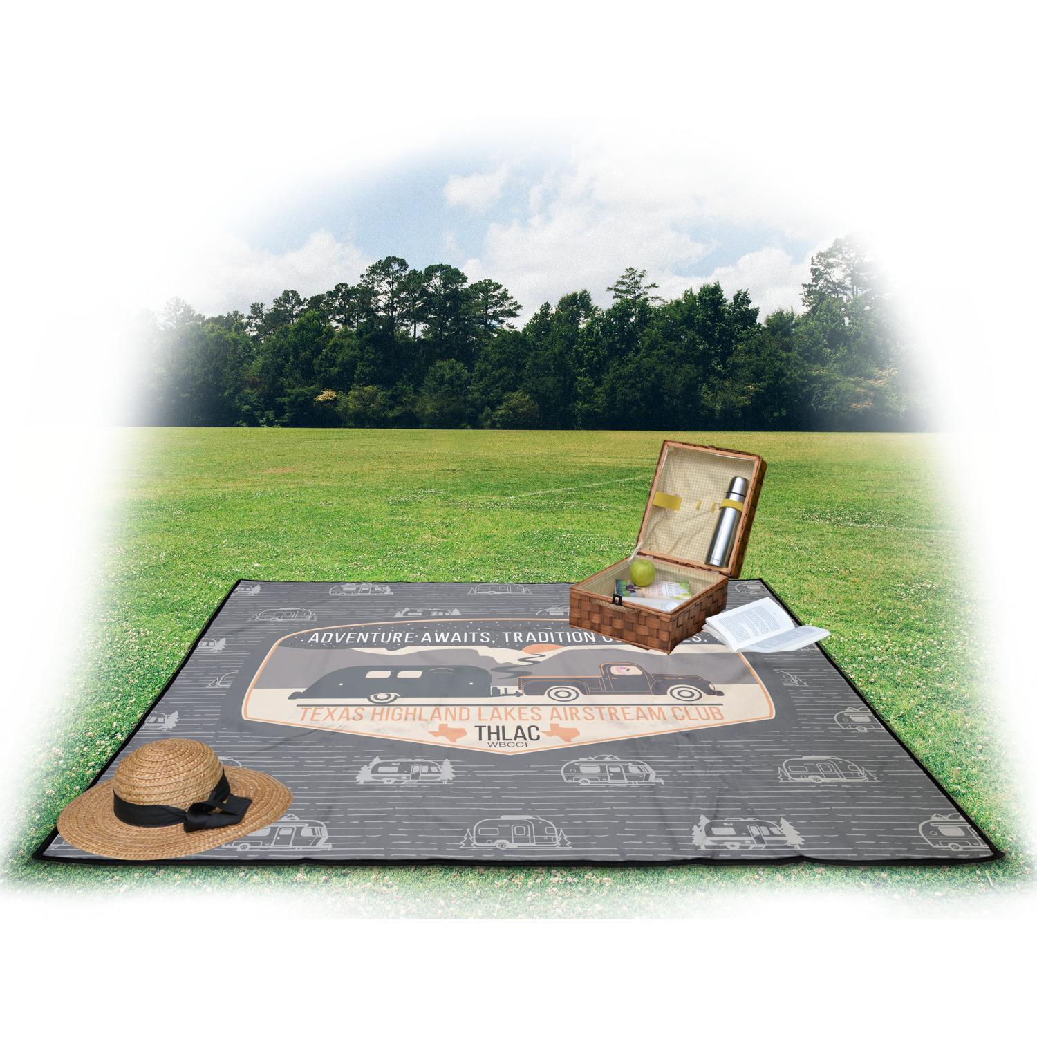 This picnic blanket is perfect for hanging out with your friends at the park or anywhere outside. The top of the blanket is made of a super soft microfiber fleece. The bottom of the blanket is made of a black material similar to a rain jacket and is water repellent as well. This will keep any wet spots on the ground from soaking through your picnic blanket. No one likes a wet blanket. The blanket measures at approximately 50" x 59" and has a nicely finished ribbon edge.