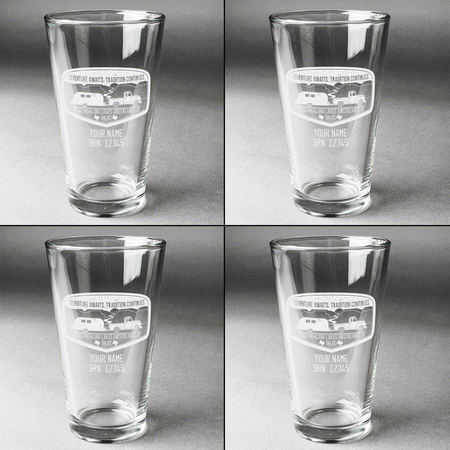 Available in a single glass or a set of 4 - each glass will be custom engraved with your design. Each glass holds 16 oz and measure 5.75"H x 3.5"W.