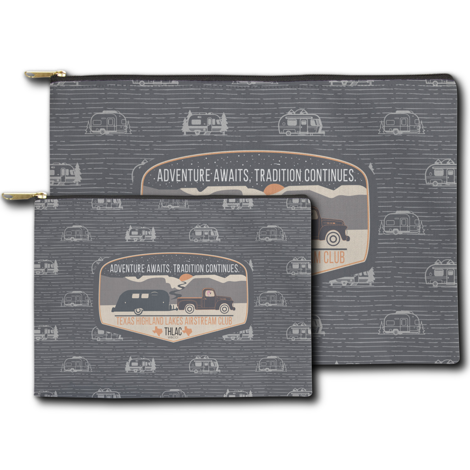 Our zippered pouches are available in two sizes - small: approx 8.5W"x6H and large: approx 12.5Wx8.5H. The pouches are made from a soft & durable canvas fabric that is printed on the outside with your design; the inside has a fused black lining. The printed canvas fabric is then cut and the pouches are sewn right here in the USA. The zipper itself is gold in color and has a round hook.