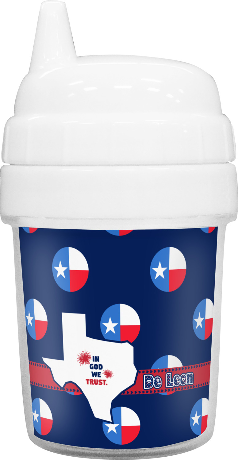 Our toddler cups are free of BPA, and have a twist-open lid so that you can easily fill and clean these cups for your young ones. Each cup also comes with a sippy nozzle to reduce spills. We offer these custom sippy cups in two different sizes; we have a baby sippy cup that holds 5 ounces, and a toddler sippy cup that holds 10 ounces. Your customization is printed on a premium glossy media insert that is placed within these toddler drinking cups.