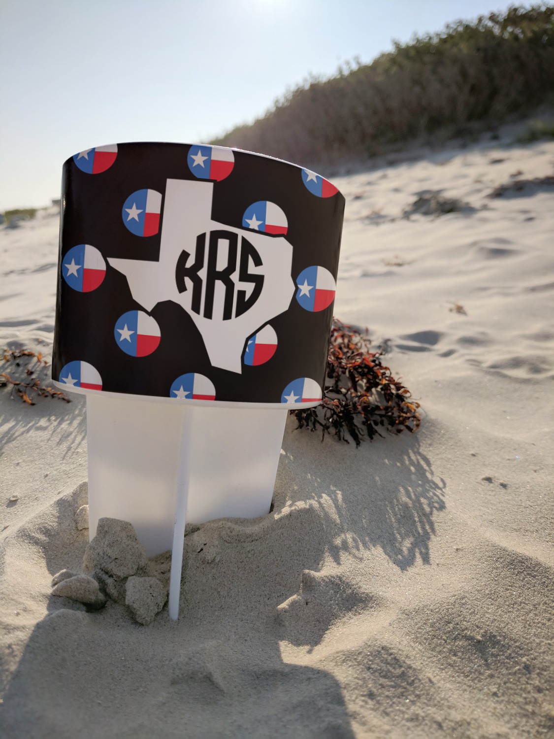 This cup holder has a large stake at its bottom that anchors it to the sand or ground below, while the cup holder rests above the stake. The entire drink holder is made of durable plastic and displays your customization around the cup holder portion. We sell these personalized beach spikers in two different colors: black and white.