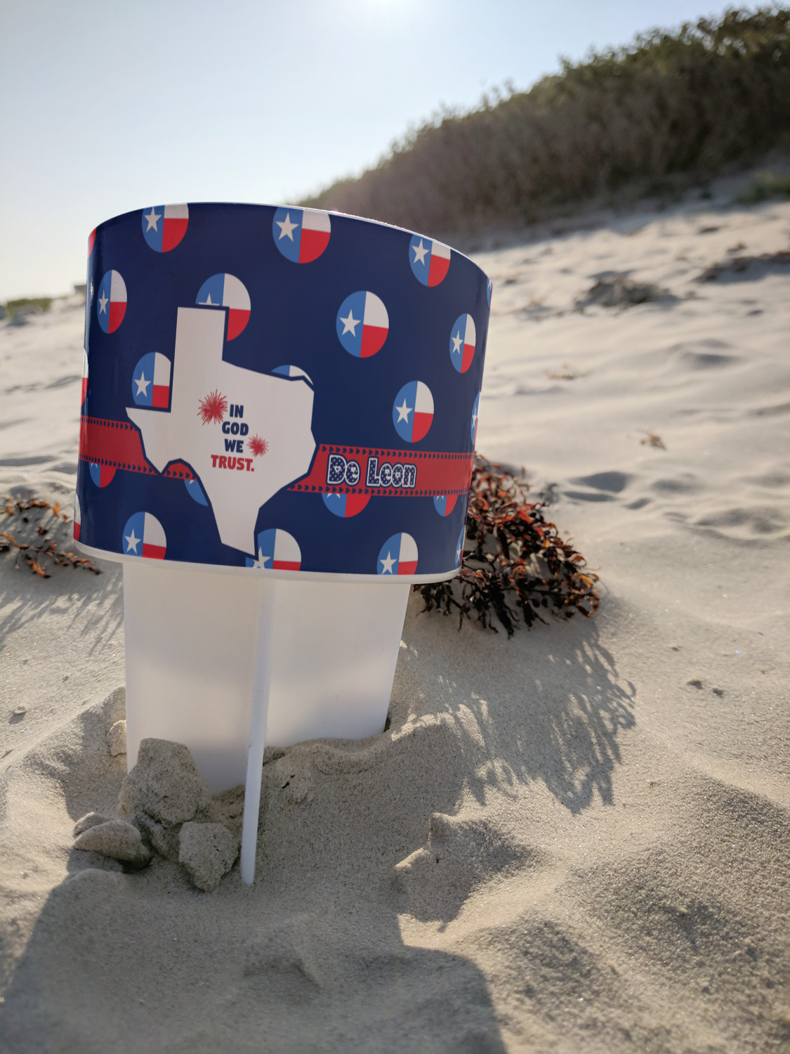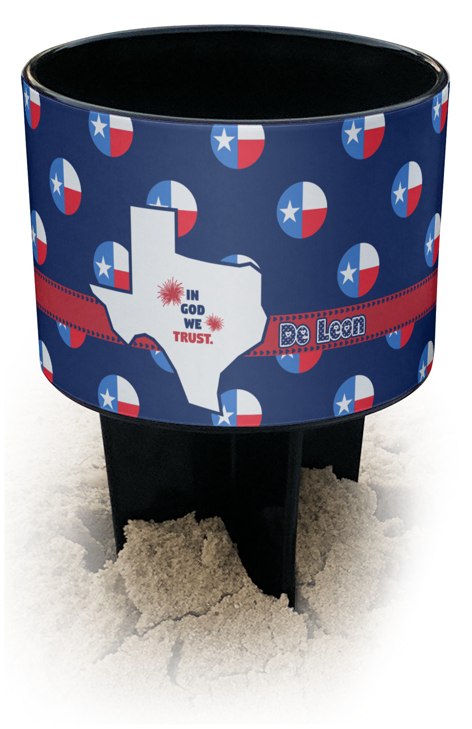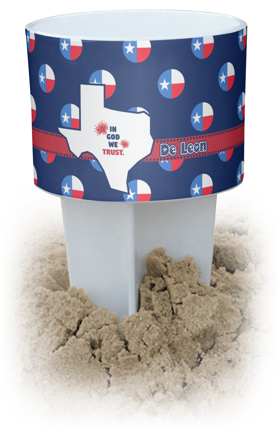 This cup holder has a large stake at its bottom that anchors it to the sand or ground below, while the cup holder rests above the stake. The entire drink holder is made of durable plastic and displays your customization around the cup holder portion. We sell these personalized beach spikers in two different colors: black and white.