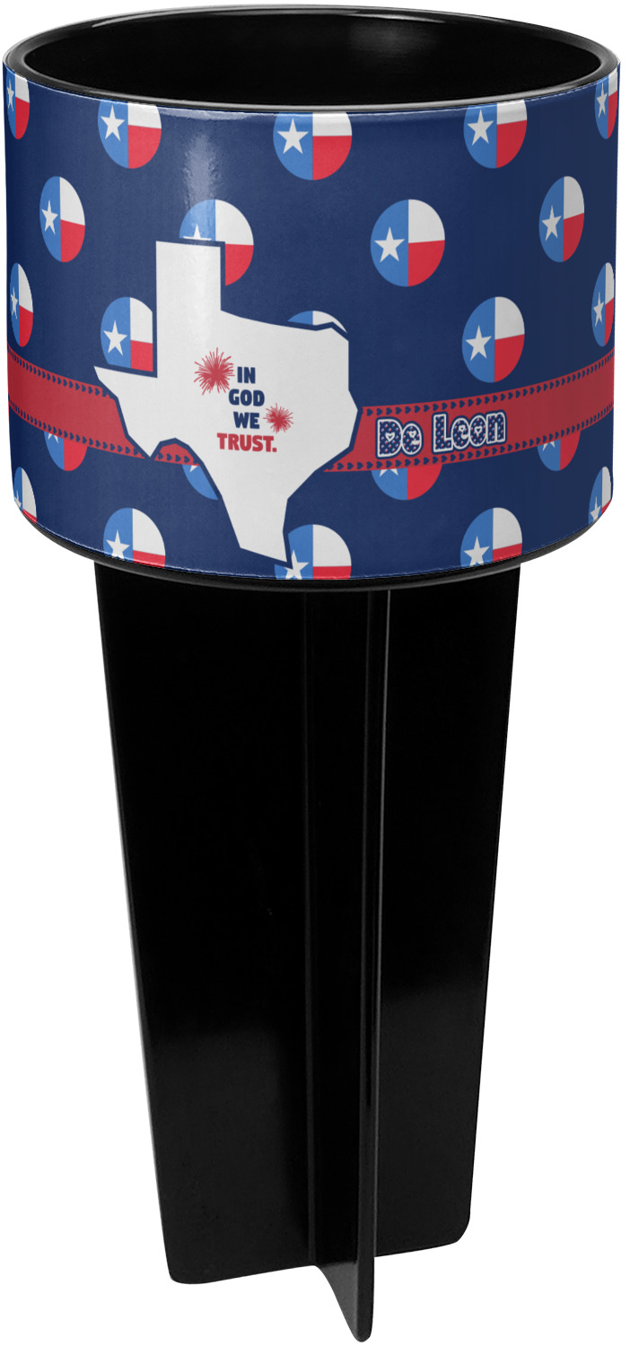 This cup holder has a large stake at its bottom that anchors it to the sand or ground below, while the cup holder rests above the stake. The entire drink holder is made of durable plastic and displays your customization around the cup holder portion. We sell these personalized beach spikers in two different colors: black and white.