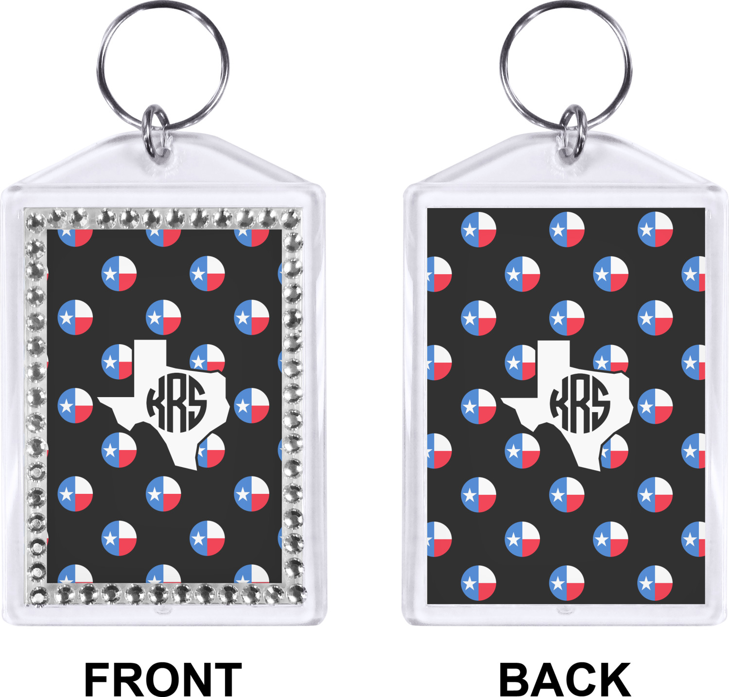 Our personalized keychains have a bold, rectangular shape, outlined by a series of shimmering rhinestones. A metal, split keyring is included with your purchase, and an additional metal hoop allows for attachment of the keychain to the split ring. This unique keychain measures at about 3.75 by 2.5 inches. We print your customized design(s) across both the back and front of this keychain.