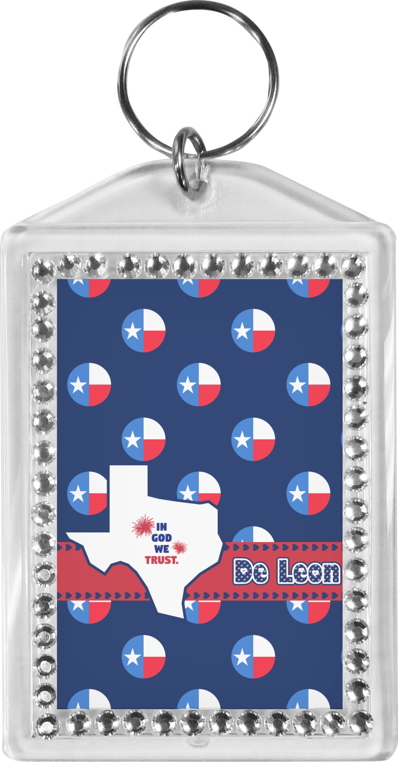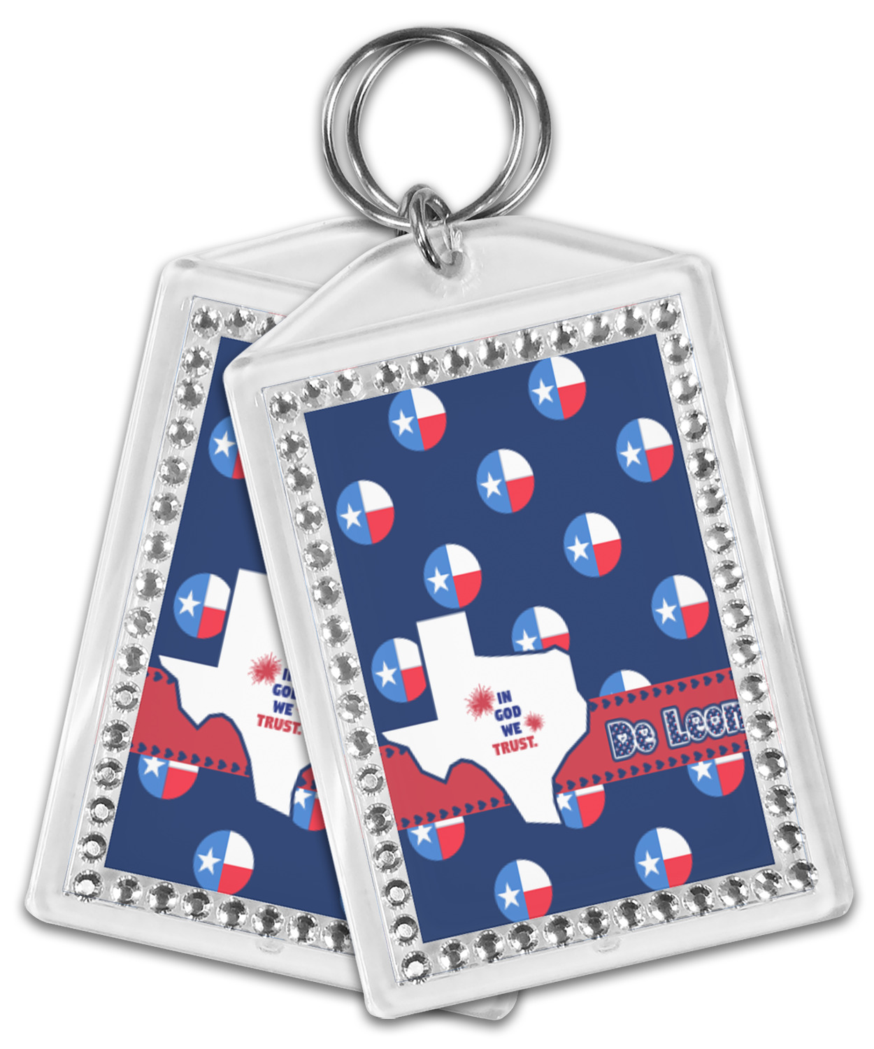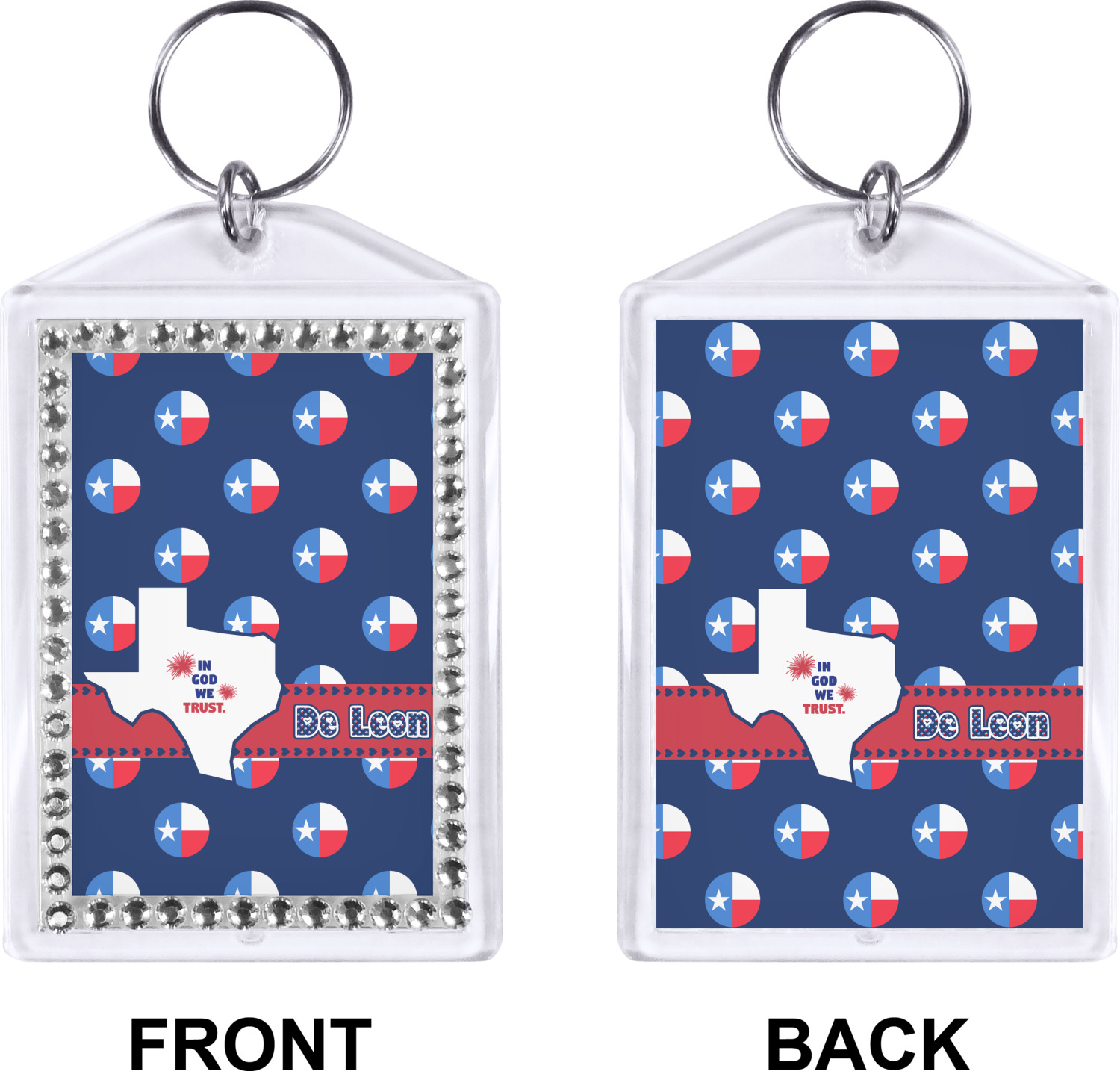 Our personalized keychains have a bold, rectangular shape, outlined by a series of shimmering rhinestones. A metal, split keyring is included with your purchase, and an additional metal hoop allows for attachment of the keychain to the split ring. This unique keychain measures at about 3.75 by 2.5 inches. We print your customized design(s) across both the back and front of this keychain.