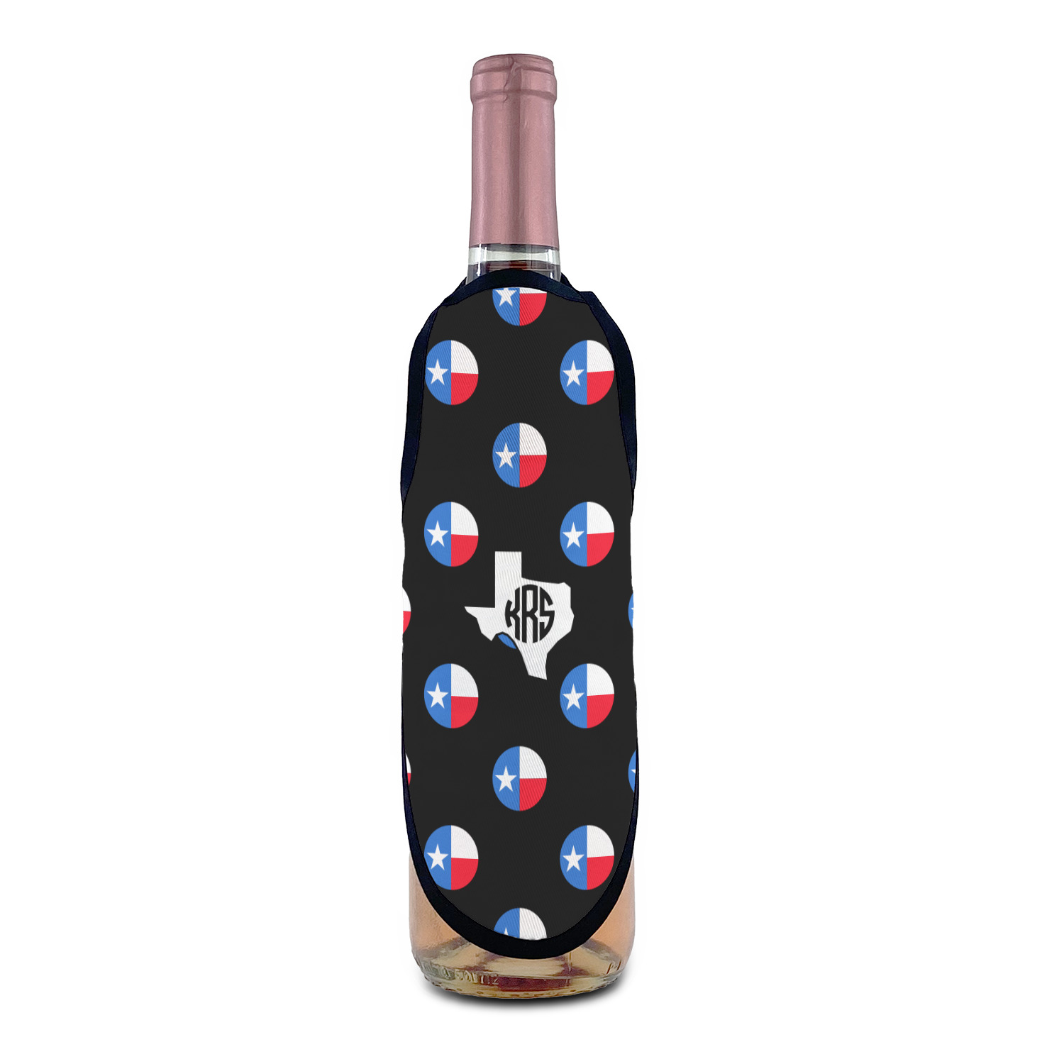 Made from a polyester fabric with black trim and tie string, these bottle aprons fit most large sized bottles including wine bottles, liquor bottles and dish soap bottles. With an included sliding cord lock the neck is adjustable to make these be a universal fit for most any sized bottle. The printed space of the apron measures approximately 8.5" tall and at its widest point the printed area is 6" wide.