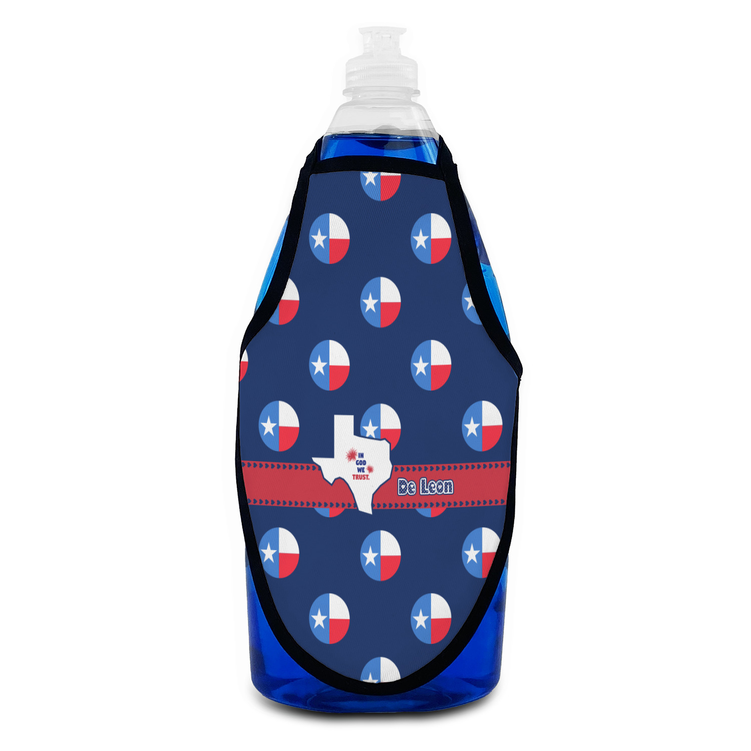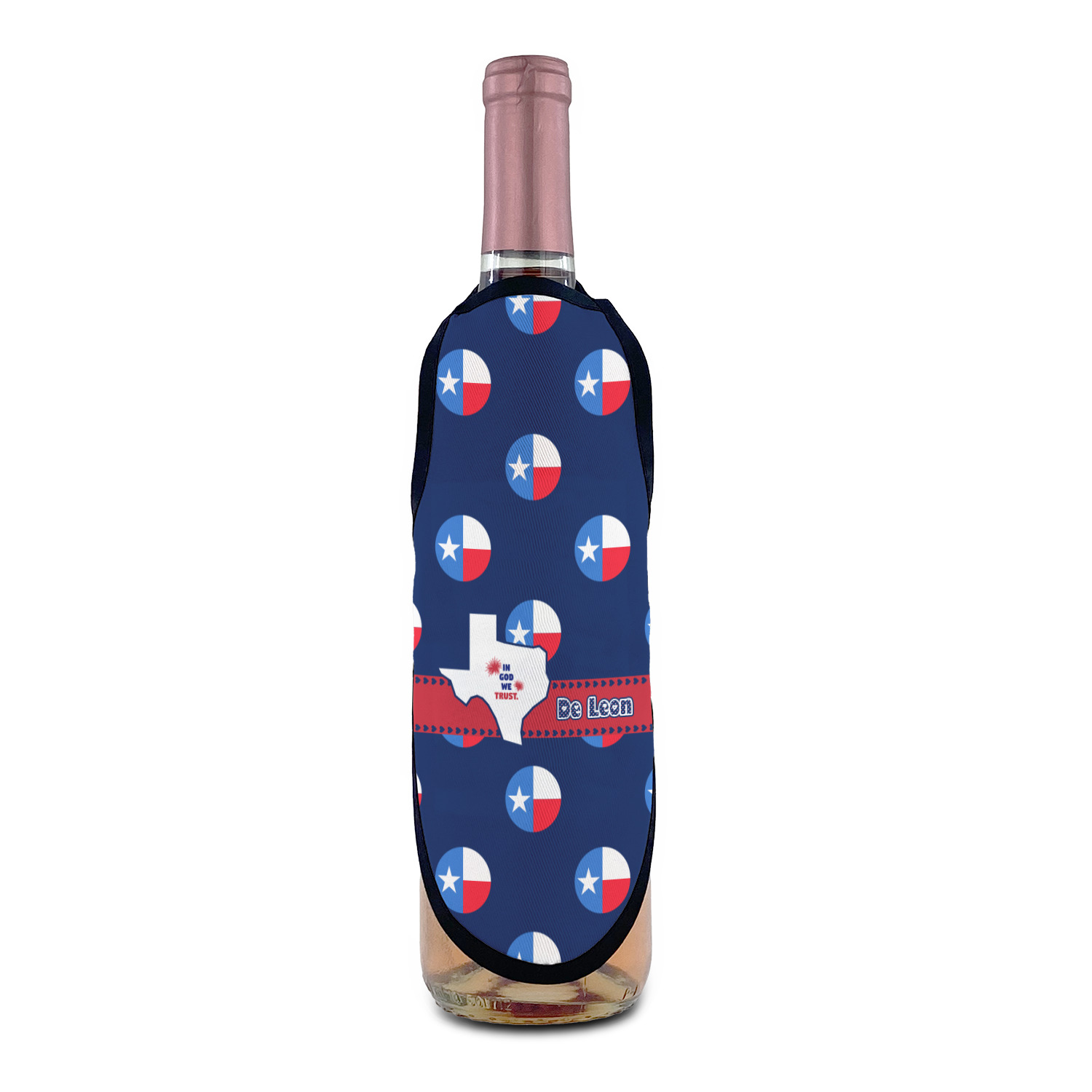 Made from a polyester fabric with black trim and tie string, these bottle aprons fit most large sized bottles including wine bottles, liquor bottles and dish soap bottles. With an included sliding cord lock the neck is adjustable to make these be a universal fit for most any sized bottle. The printed space of the apron measures approximately 8.5" tall and at its widest point the printed area is 6" wide.