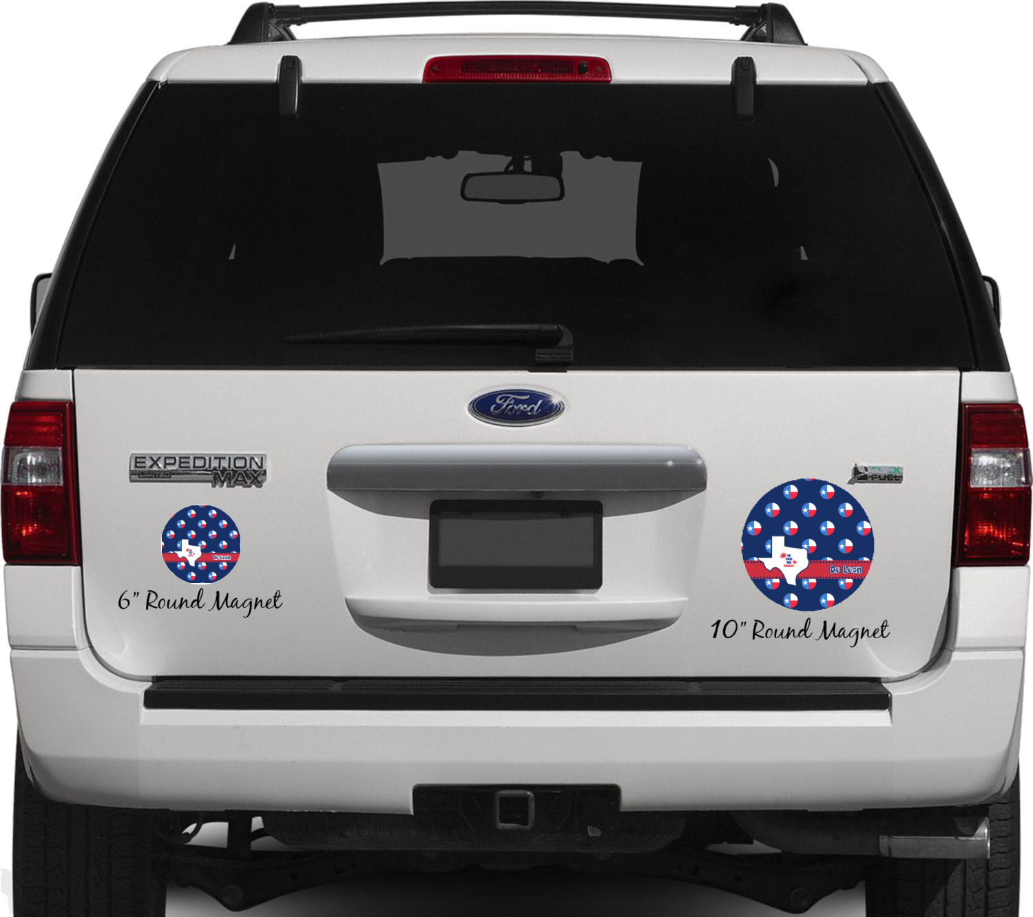 Your personalized car magnets are available for purchase in two shapes and two sizes. We carry round and square editions; each shape can either be 6 by 6 inches, or 10 by 10 inches, depending on your needs. Both versions are 1 millimeter thick, which is considered, within the industry, as the ideal thickness for automobile magnets. The magnetic car decals will adhere to any smooth, metal surface of your cars body, such as the trunk door or a side panel. However, please note that some vehicles are constructed from fiberglass bodies, which prevents the adhesion of anything magnetic. We advise that you test your vehicle before purchasing these magnets.