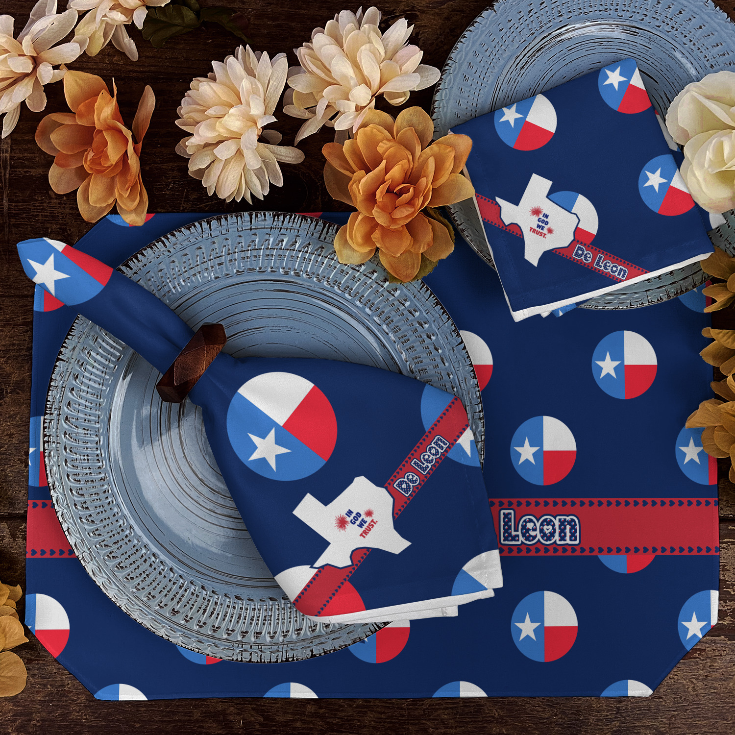 Each customizable cloth napkin is a polyester material guaranteed for long-term use. Since our napkins are cloth, it serves as a great reusable and eco-friendly dining decor. We sell personalized napkins individually or as a set of 4! Print your own unique design on all four napkins, or create four individual designs for each napkin! We offer two different napkin sizes - Cocktail napkins (approx. 10 x 10) and Dinner napkins (approx. 20 x 20). We print your design on one side, perfect for displaying your custom designed lunch napkins in any fold or table setting!