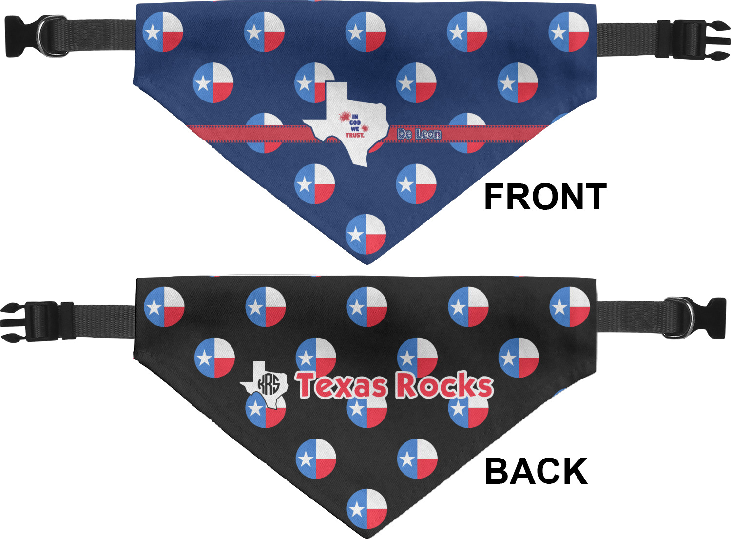 We print the front and back of these dog bandanas with your customized design. The bandana itself is made from a durable polyester, sewn together with a gap large enough to accommodate any collar. Regardless, the bandana includes a plain black, canvas collar with plastic snaps, that can easily be removed if desired. These dog bandana collars are available in four sizes: small, medium, large, and extra large. Please see our sizing chart for more information regarding the dimensions of each size.