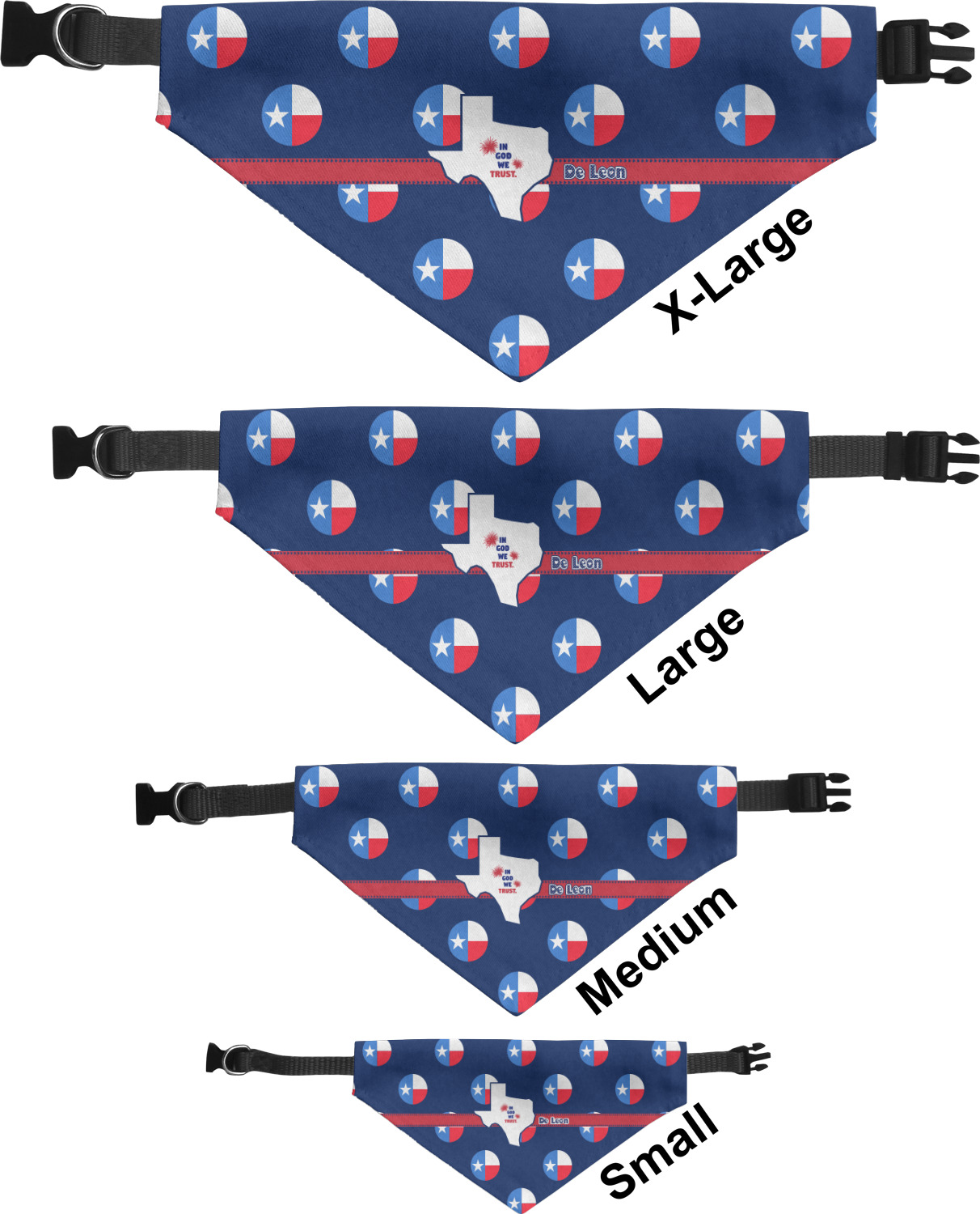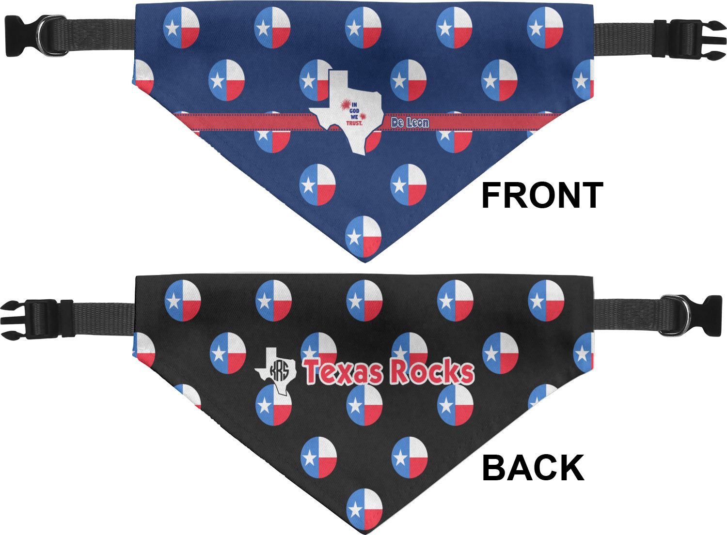 We print the front and back of these dog bandanas with your customized design. The bandana itself is made from a durable polyester, sewn together with a gap large enough to accommodate any collar. Regardless, the bandana includes a plain black, canvas collar with plastic snaps, that can easily be removed if desired. These dog bandana collars are available in four sizes: small, medium, large, and extra large. Please see our sizing chart for more information regarding the dimensions of each size.