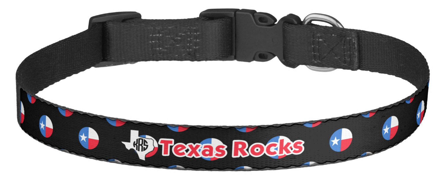 This sturdy collar, made from a durable nylon weave, will outlive your dog's episodes of excited tugging and pulling. Courtesy of its thick plastic buckle and adjuster, this collar is adjustable and accommodating of any dog. Structurally, the collar is a single piece of nylon weave that is sewn together, and features a solid metal loop where you can attach a leash or dog tag. We print and display your dog's name and pattern across the middle of the personalized dog collar.