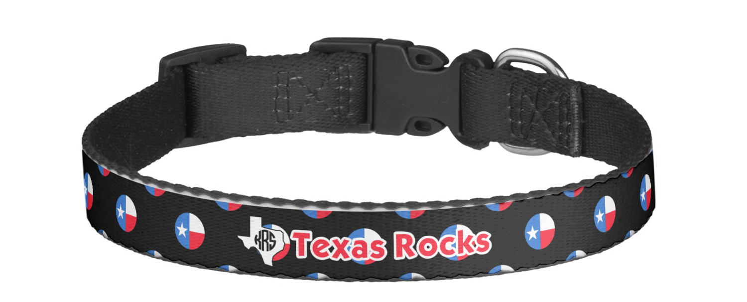 This sturdy collar, made from a durable nylon weave, will outlive your dog's episodes of excited tugging and pulling. Courtesy of its thick plastic buckle and adjuster, this collar is adjustable and accommodating of any dog. Structurally, the collar is a single piece of nylon weave that is sewn together, and features a solid metal loop where you can attach a leash or dog tag. We print and display your dog's name and pattern across the middle of the personalized dog collar.
