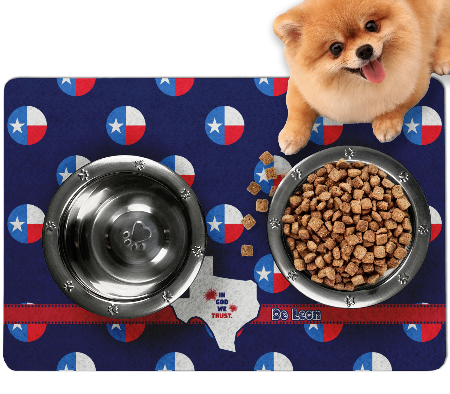 This dog bowl mat, fabricated from polyester, proudly displays your customized design on its top, while its bottom includes a non-slip rubber. This feature allows it to remain firmly in place, even when your dog spills his/her water. With 3 sizes available (18" x 12", 24" x 18", 30" x 24"), the pet food mat has ample space for both a food and water bowl for any sized dogs. Though specified for dogs' use, these mats are also a splendid option for cats.