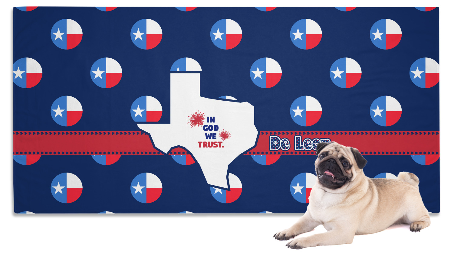 Our custom towels are crafted from a special blend of polyester and polyamide, which contributes to its lightweight, yet thoroughly absorbent nature. We craft it as such to guarantee efficiency as a convenient product; its lightweight nature makes it easy to roll up and carry along, yet it is still able to dry off even the wettest, muddiest pet. It measures at 60" x 30" and is sizable enough to dry off even the largest of pets. With our towel's gentle, soft-to-the-touch material, your pet will be sure to anticipate its warm, dry embrace. We print your personalized design on the front of the towel, while the back is white.