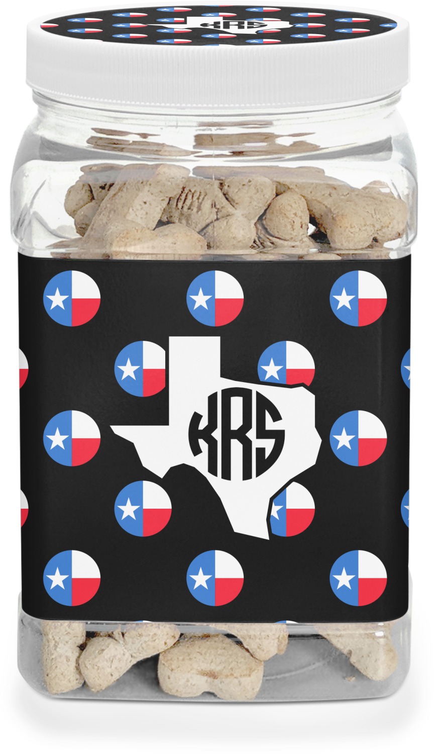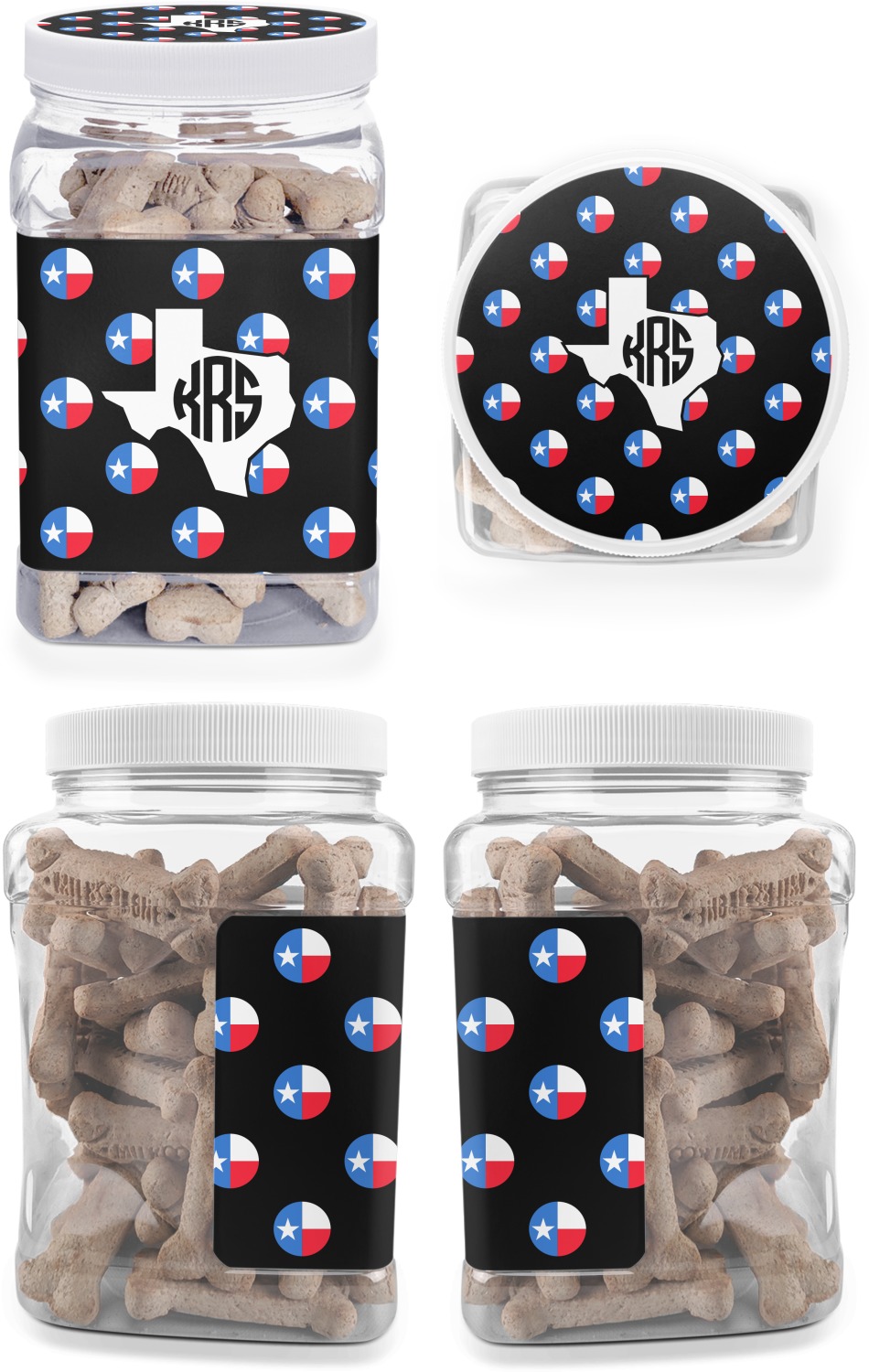 This half gallon jar, made from a sturdy plastic, is the perfect way to keep treats from any naughty pet paws, while still keeping them ready on hand for when your pup performs an impressive trick. This dog cookie jar features a screw-on, white lid that displays your personalized design on a vinyl sticker. We apply another customized sticker that wraps around the front and sides of the jar. Our dog treat jar also has indentations on the rear ends of the sides, which allows for convenient handling, and its square frame allows for easy storage.