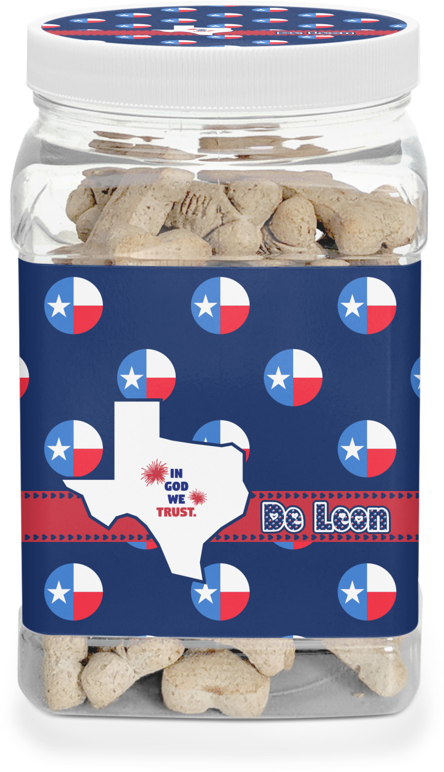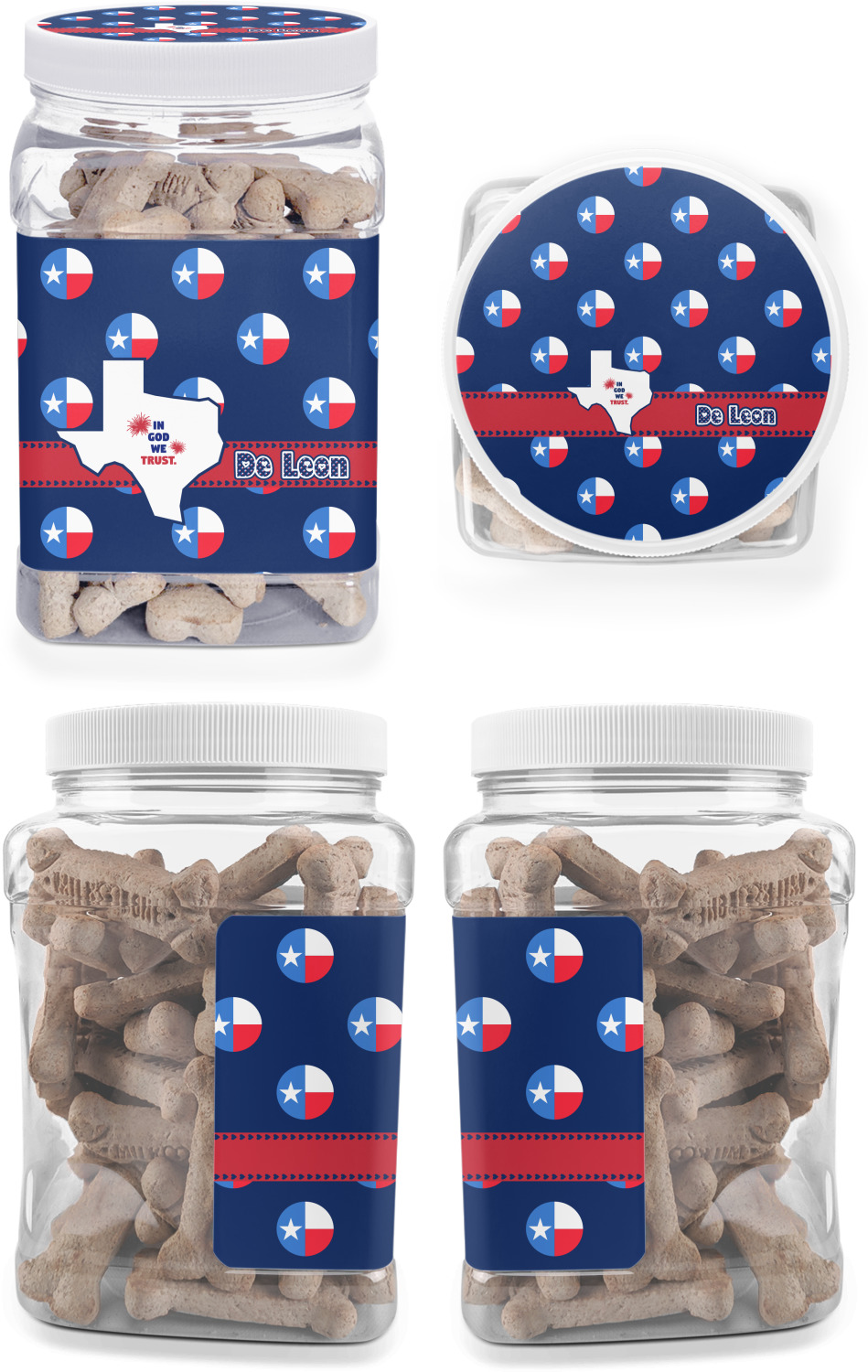 This half gallon jar, made from a sturdy plastic, is the perfect way to keep treats from any naughty pet paws, while still keeping them ready on hand for when your pup performs an impressive trick. This dog cookie jar features a screw-on, white lid that displays your personalized design on a vinyl sticker. We apply another customized sticker that wraps around the front and sides of the jar. Our dog treat jar also has indentations on the rear ends of the sides, which allows for convenient handling, and its square frame allows for easy storage.