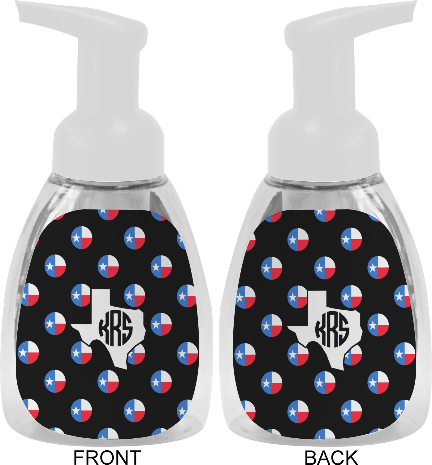 This soap dispenser is made of a robust plastic and has a clear base. The included soap pump is available in black or white color. This dispenser is 6.5 inches tall, 3 inches wide, and 2 inches deep. We display your customized designs on the front and back sides of these foaming hand soap dispensers.