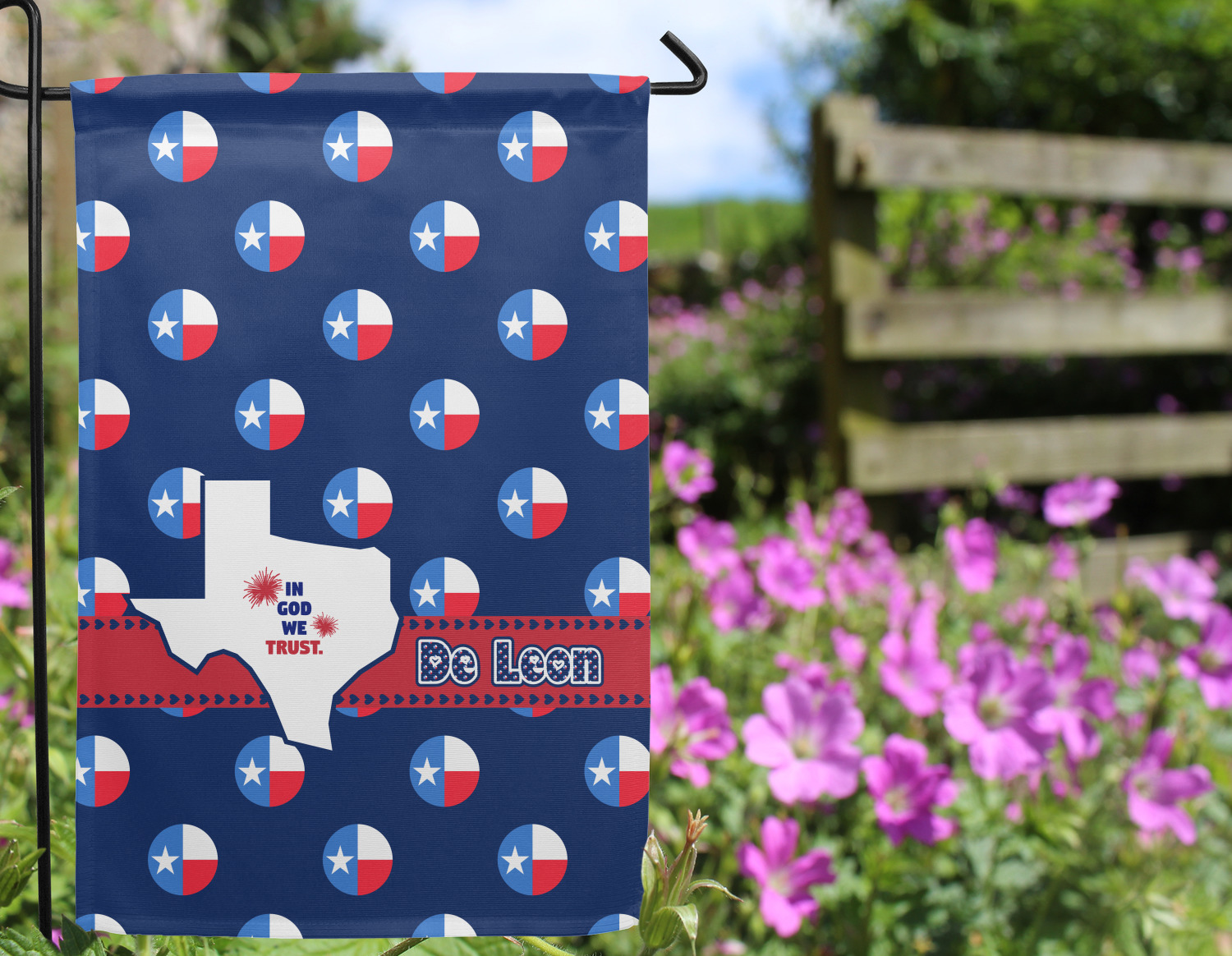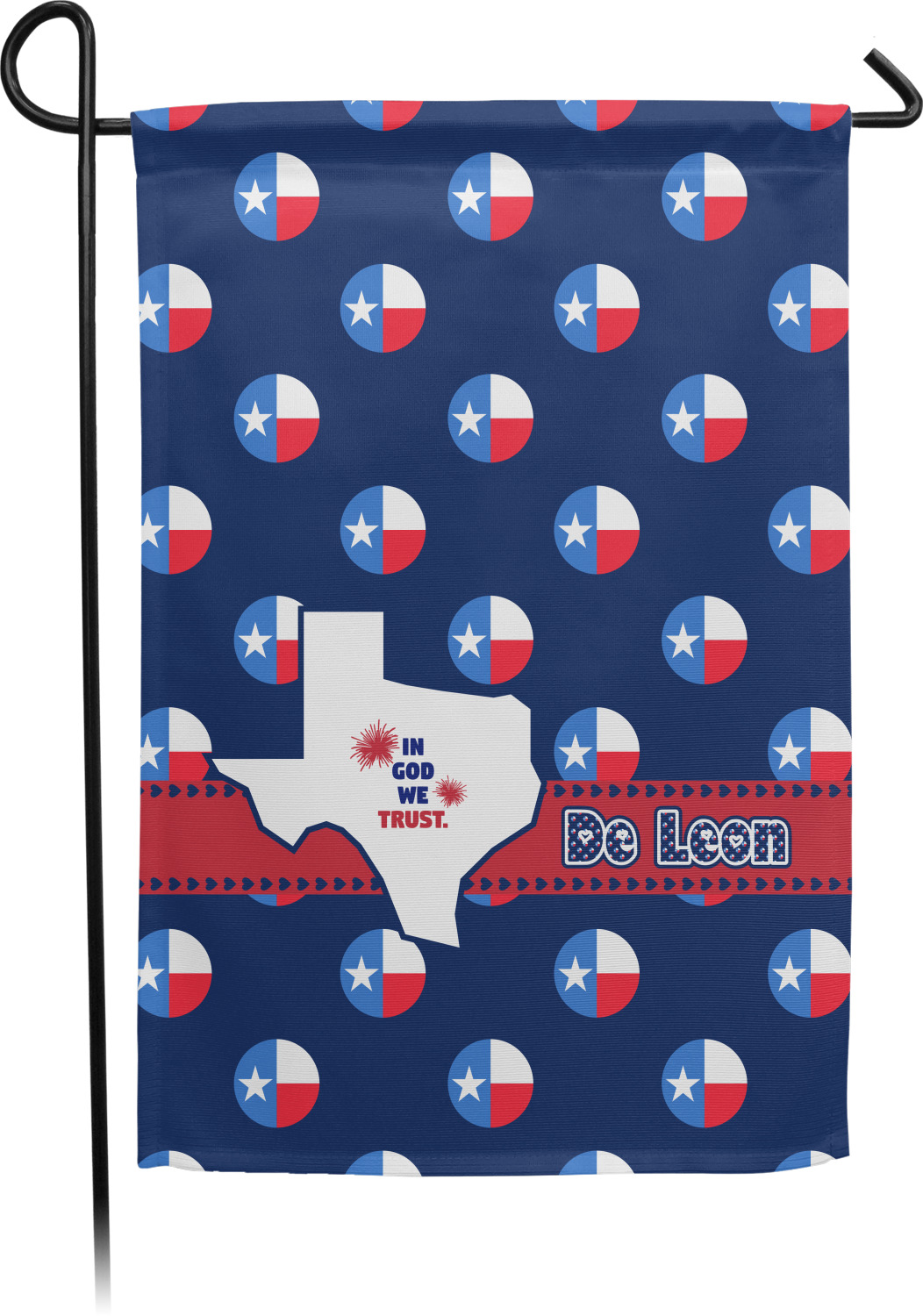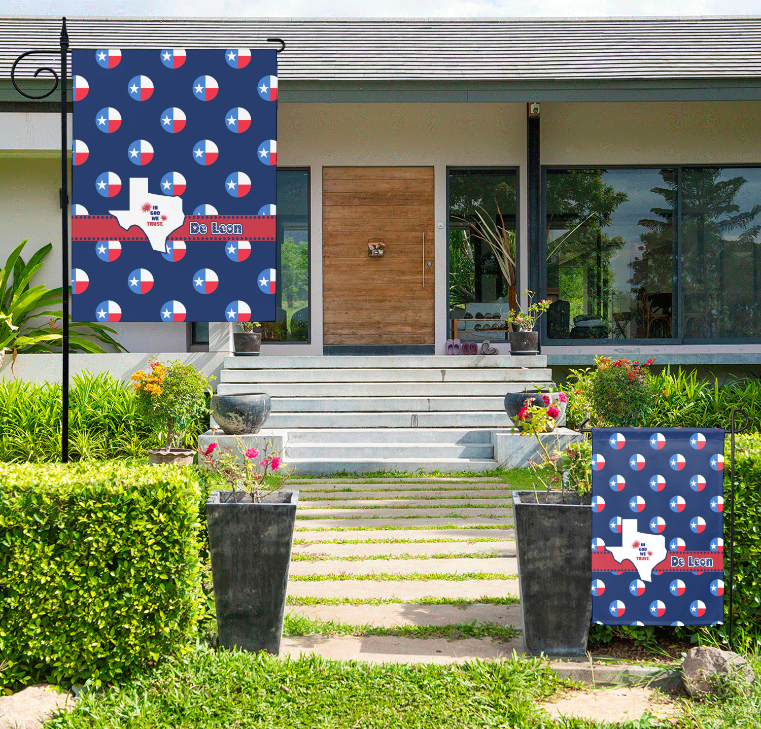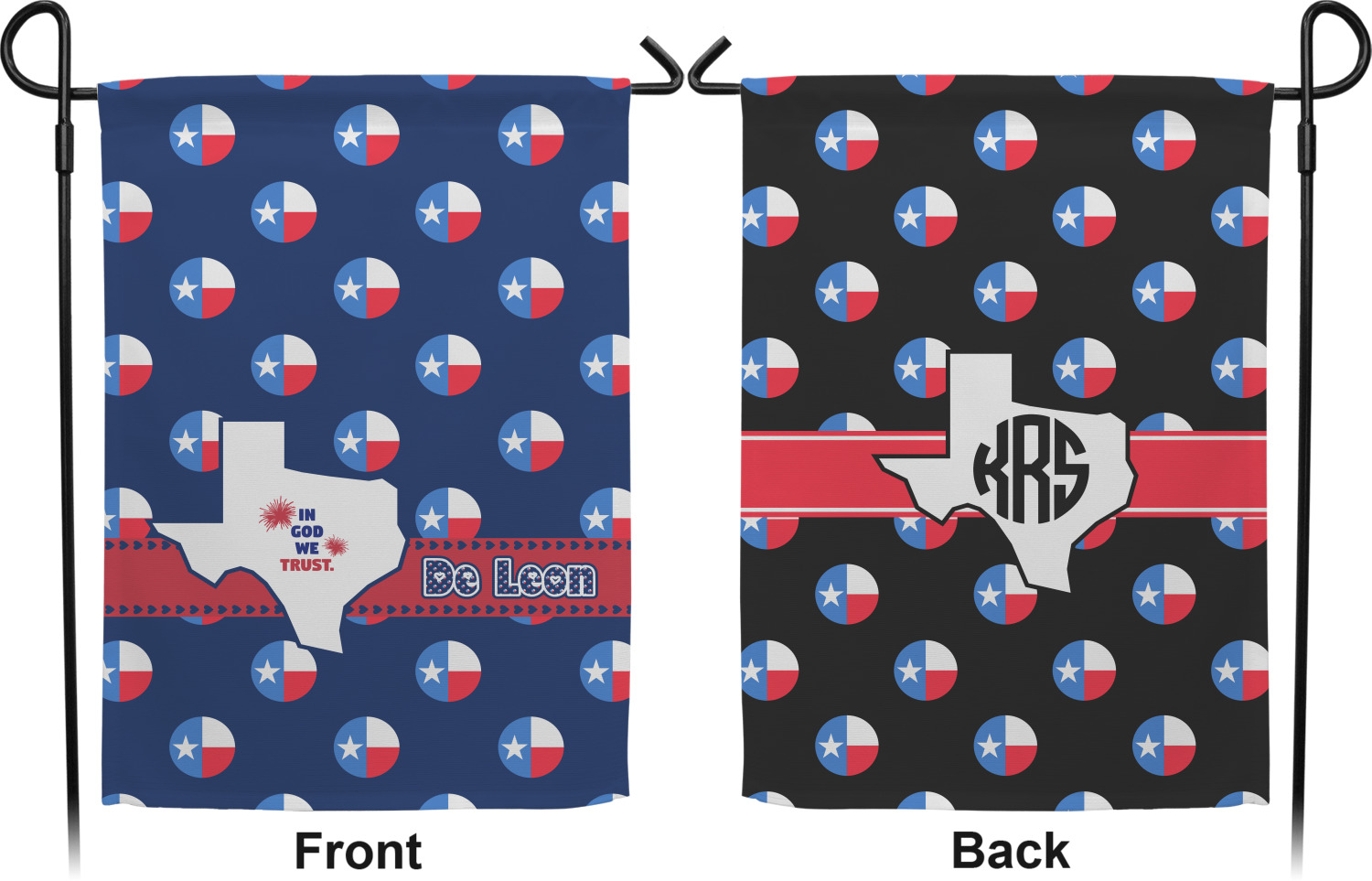 These custom garden flags are made of a durable, double-ply, polyester weave, allowing them to withstand the elements year round. The small flags measure at approximately 12 by 18 inches. The large flags measure out to 28 by 37 inches. You can order these decorative flags with your customization printed on the front only, or the front and back.