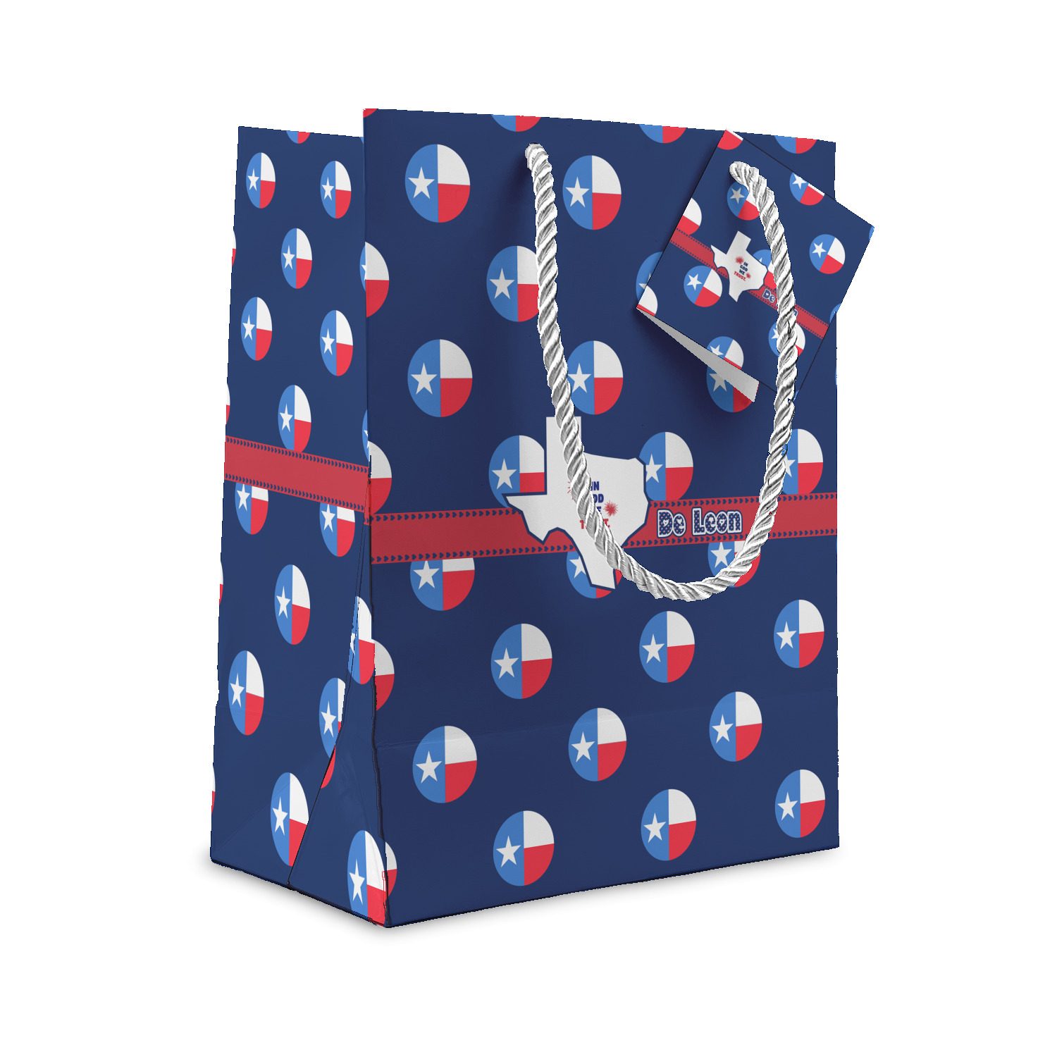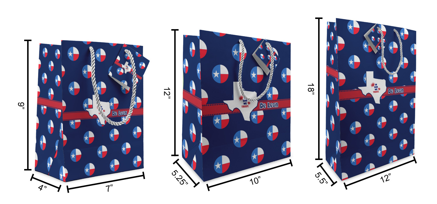 | Size (Varies By Option) | Small Gift Bag (7" x 4" x 9") Medium Gift Bag (10" x 5.25" x 12") Large Gift Bag (12" x 5.5" x 18") |