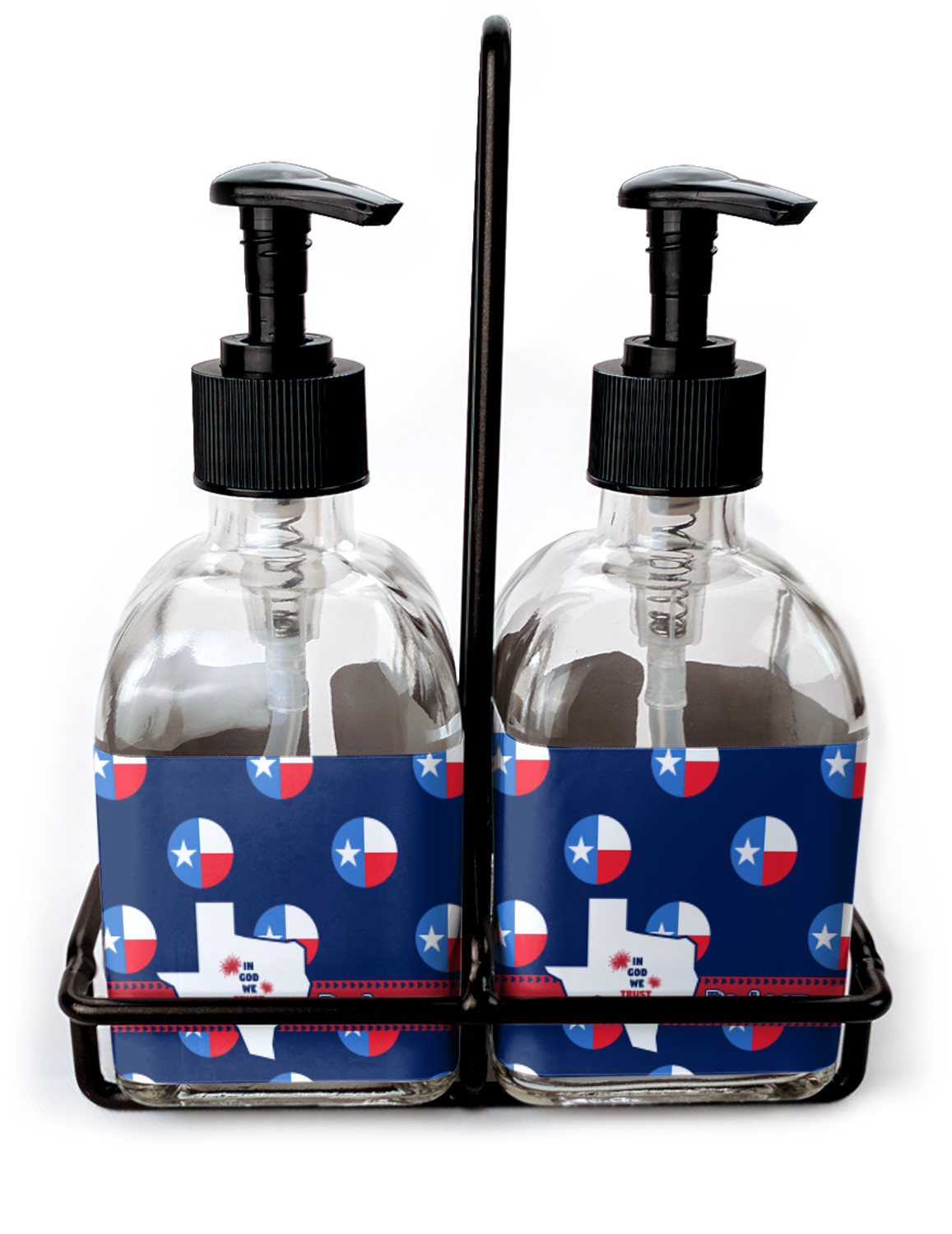 You can purchase these personalized soap dispensers as singulars, or as a set with two bottles. With your purchase of the set, we include a black frame that complements the black color of the pumps and adds to the overall classy look of the piece.