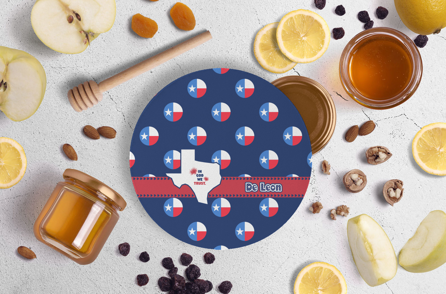 Made from rubber and a polyester top, these personalized jar openers serve as a functional addition to your kitchen counter-top. With its light weight and thin structure, these manual jar openers are straightforward and easy to use. The tool has a 5" diameter, and can therefore fit over most jars that have a diameter smaller than 4".
