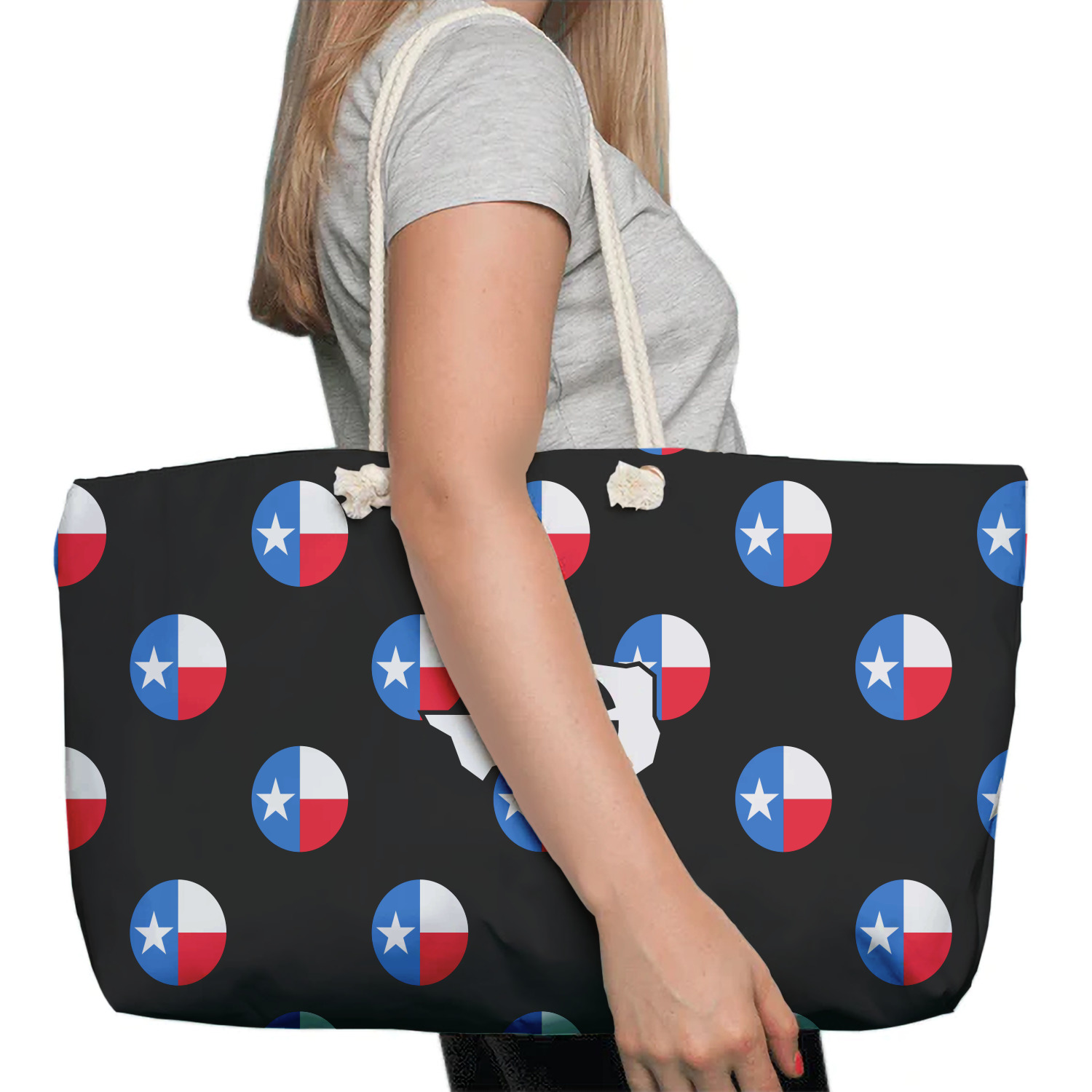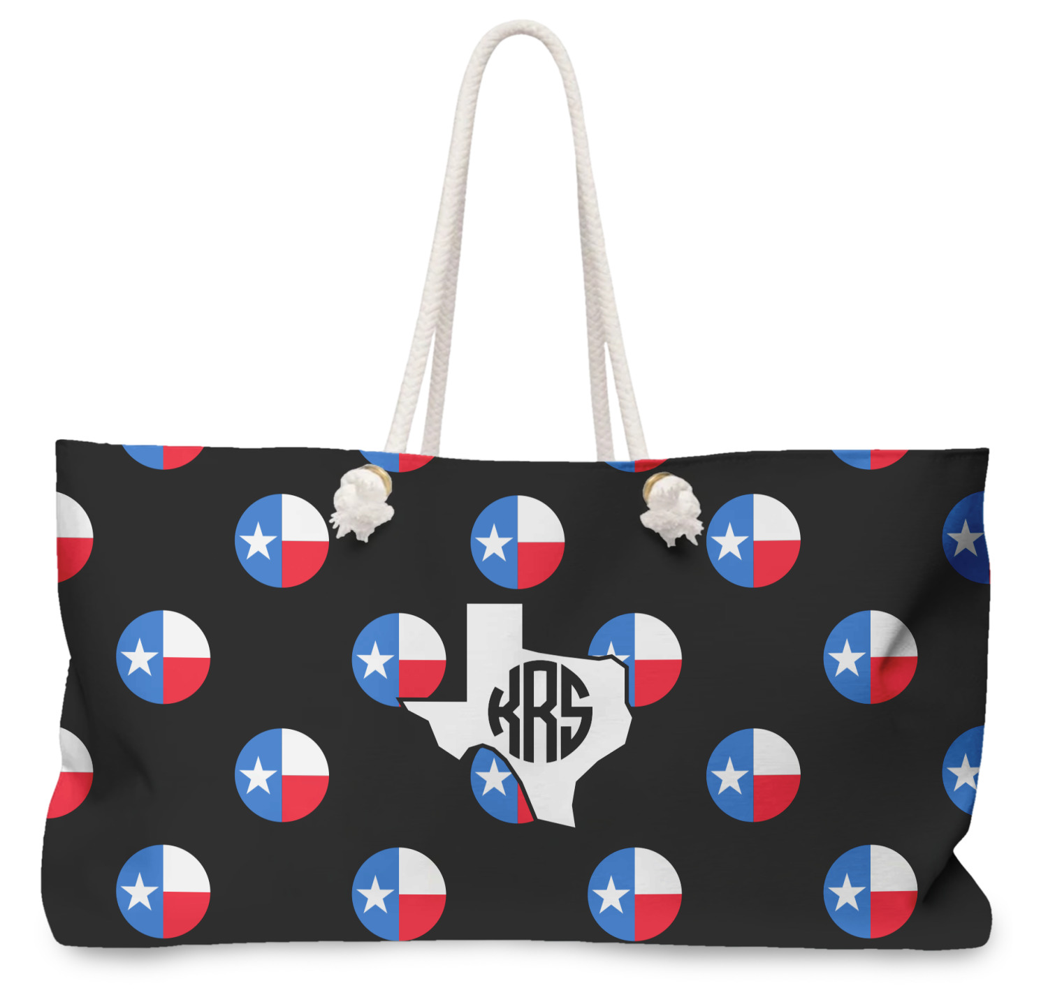 Our oversized weekender tote with rope handles is perfect for your weekend at the beach or on the town. This large tote are 24" W X 13" H, with a 5" gusset and a 27" thick rope handles with a knot that is put through a grommeted brass hole.