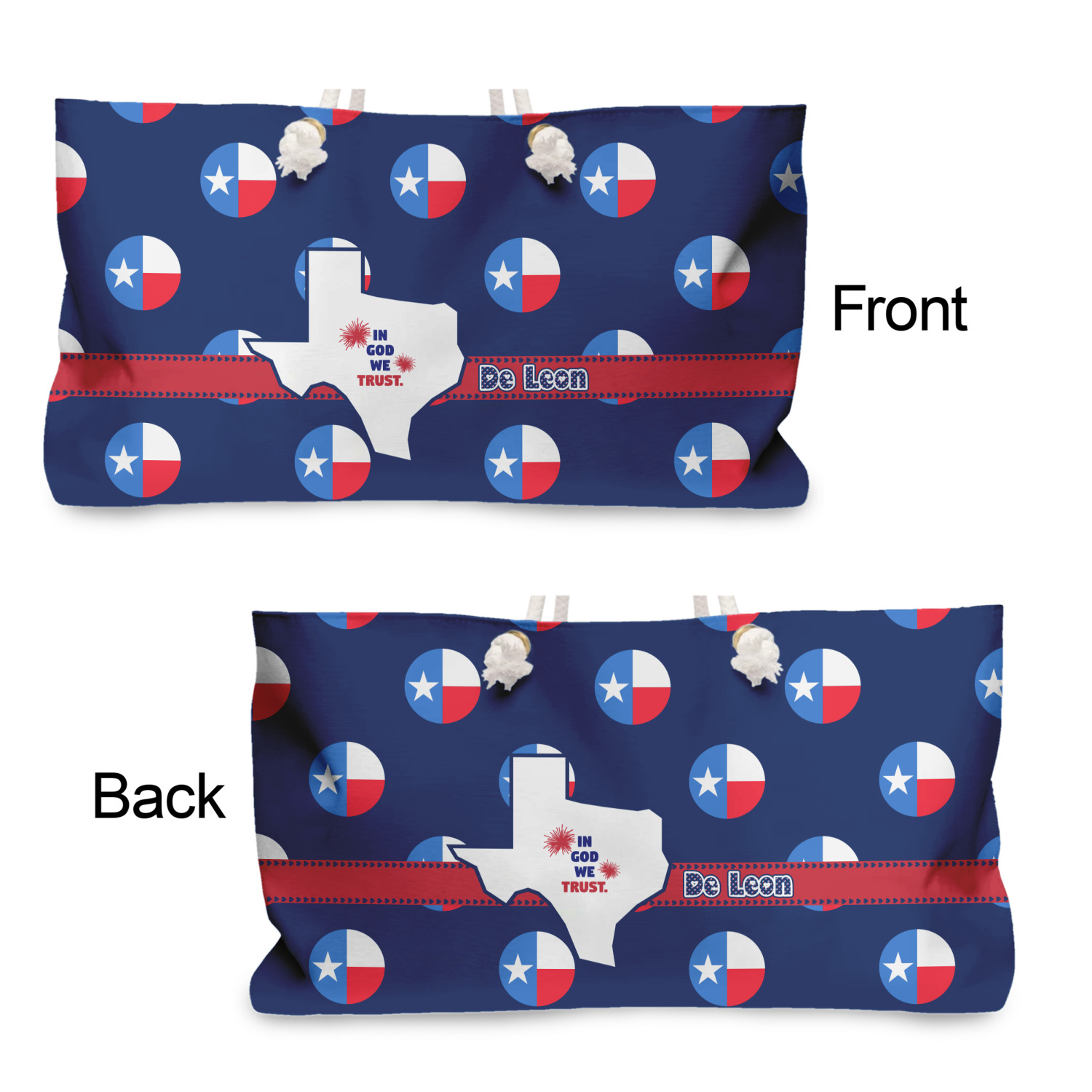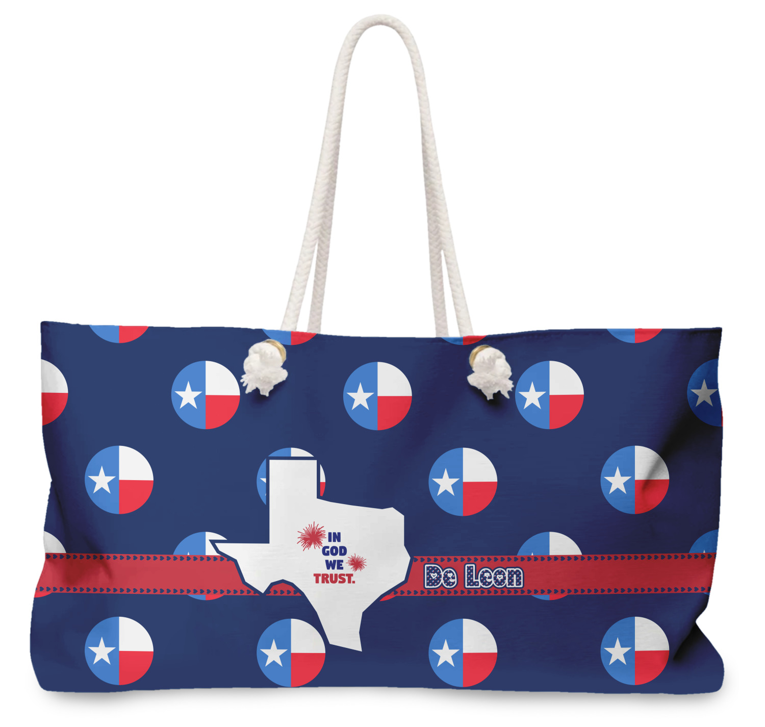Our oversized weekender tote with rope handles is perfect for your weekend at the beach or on the town. This large tote are 24" W X 13" H, with a 5" gusset and a 27" thick rope handles with a knot that is put through a grommeted brass hole.