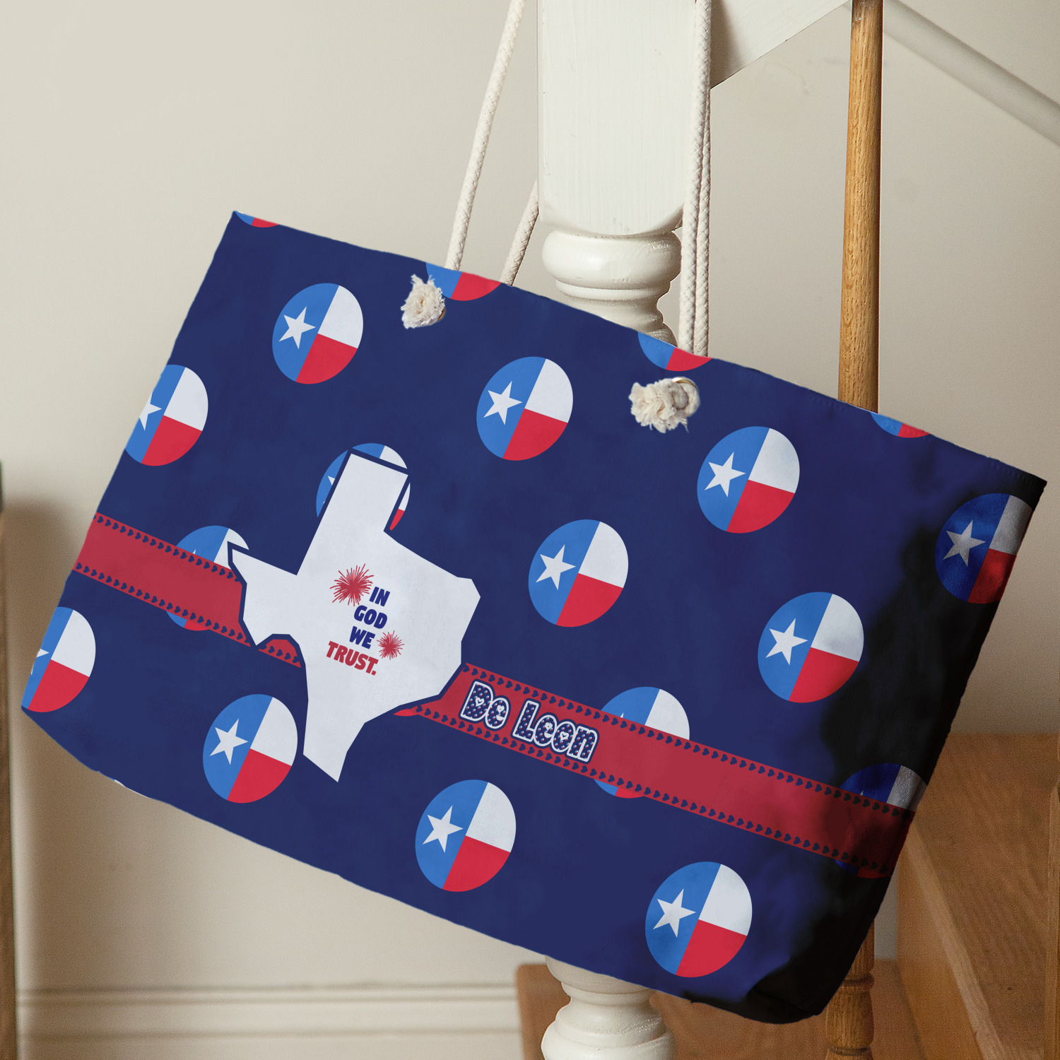 These large totes are handmade i.e. printed, cut and sewn right here in the USA. The canvas like material is printed using dye sublimation; the fabric is then cut and sewn along with a beautiful cream colored lining (to match the rope handles). The brass grommets are then added and the cream colored rope if fed through the grommets and knotted.
