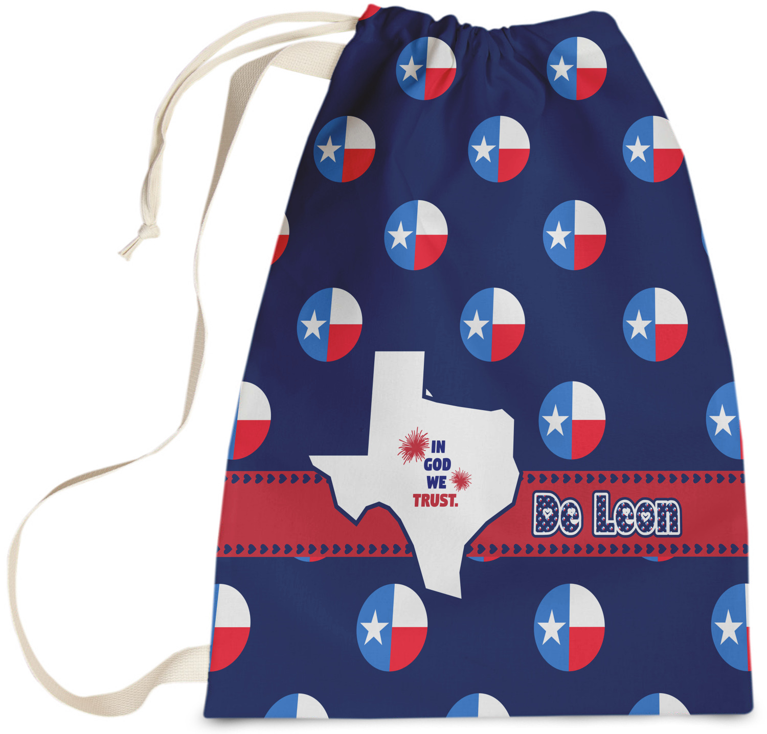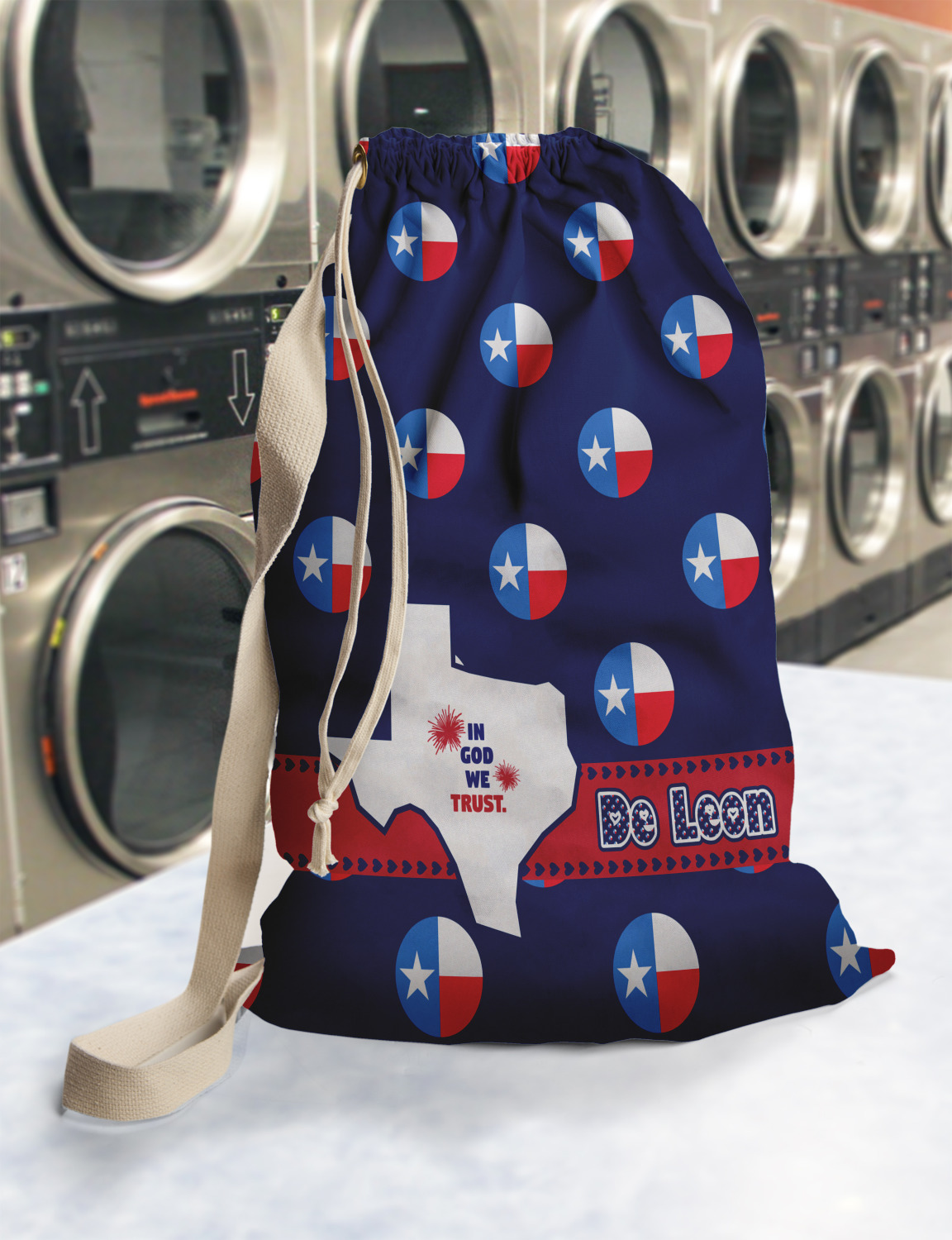 Carry your laundry in style with these customized laundry bags. Available in two sizes, featuring a natural colored woven strap and a cinch cord, these bags hold a lot of clothes or anything else you want to fit in them.