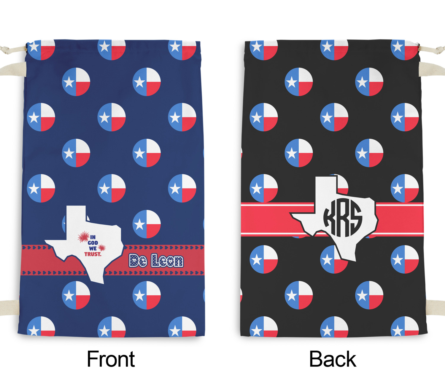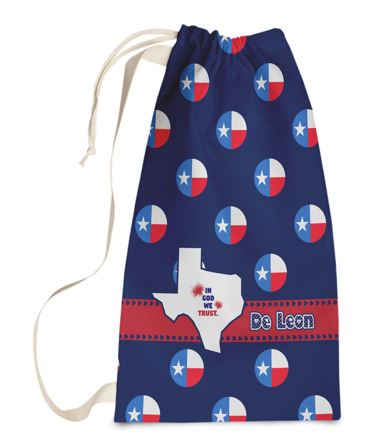 Carry your laundry in style with these customized laundry bags. Available in two sizes, featuring a natural colored woven strap and a cinch cord, these bags hold a lot of clothes or anything else you want to fit in them.
