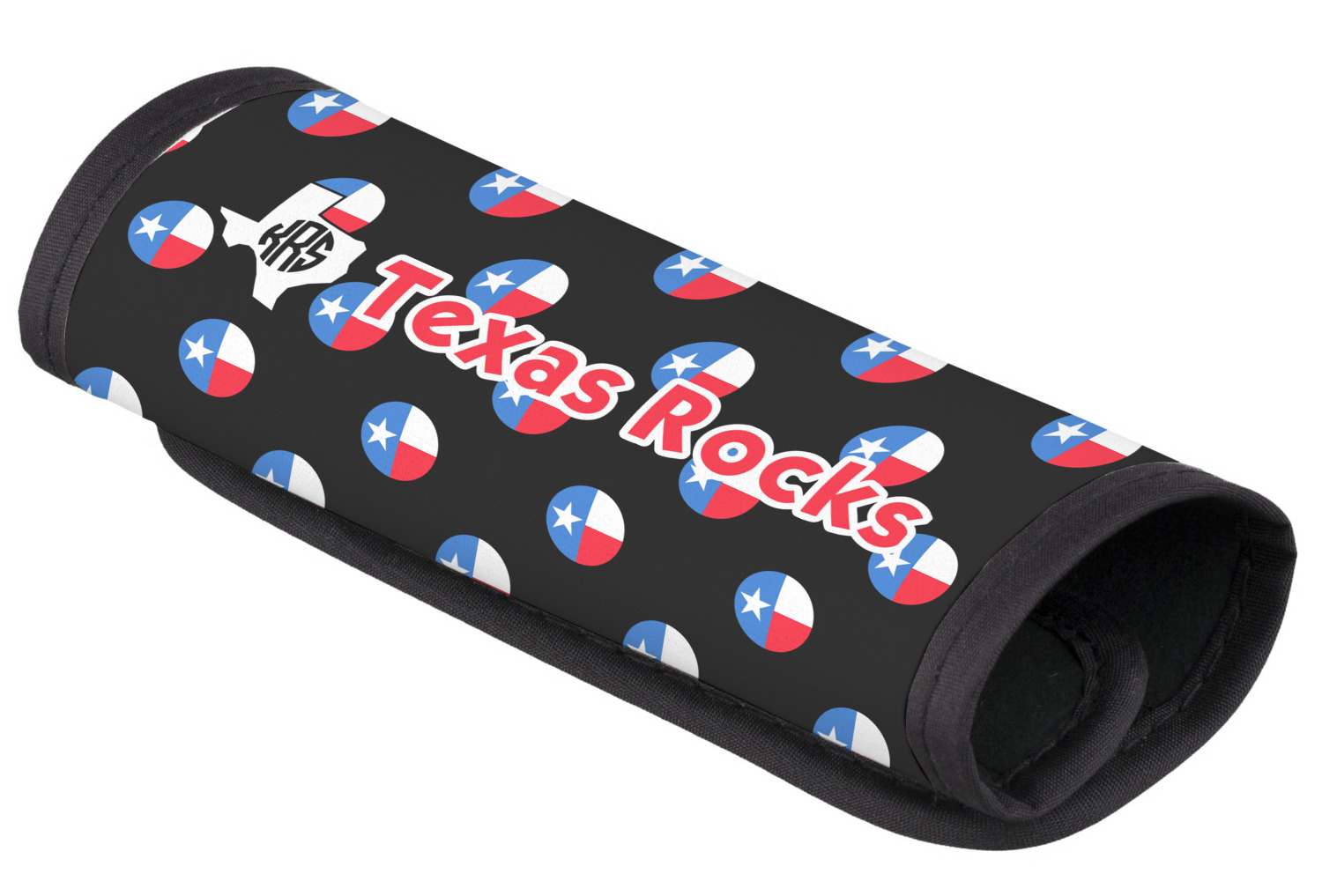 The luggage handle covers are made of neoprene with black trim and have Velcro closure to snugly fit around the handle. Your design is printed on the neoprene. The covers measure approx 5"x6".