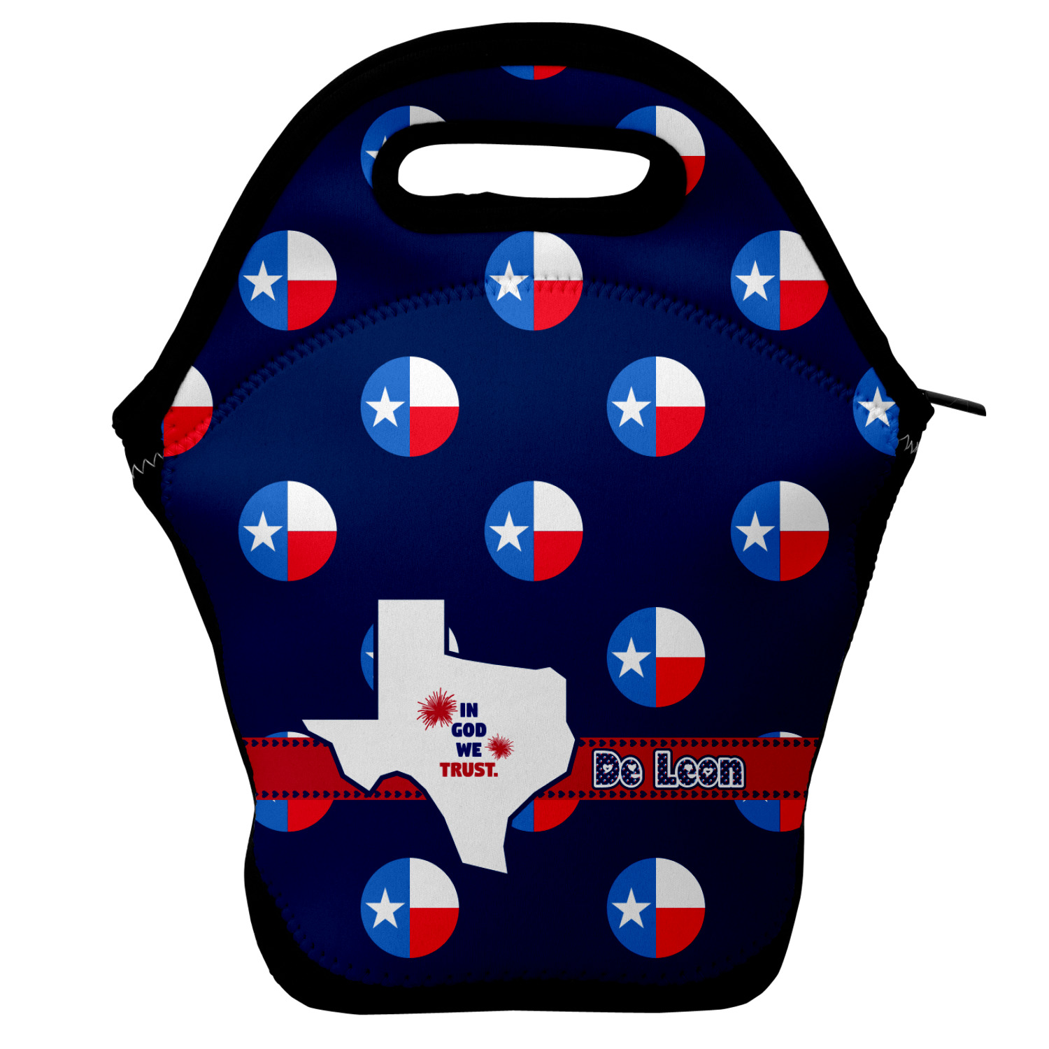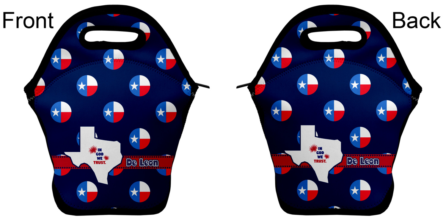 Our personalized lunch bags are made from a strong neoprene, and secure with a zipper closure that lines the top of the bag.The edges of the neoprene are sewn together with a heavy duty stitch, adding to the durability of the bag. The is accompanied by a reinforced handle at its top, for the easy transport of your lunch. We display your personalization across both the front and back of this neoprene lunch bag, while the remaining sides are a sleek black in color. Each bag measures at 13.5 inches tall, and 11.5 inches wide.