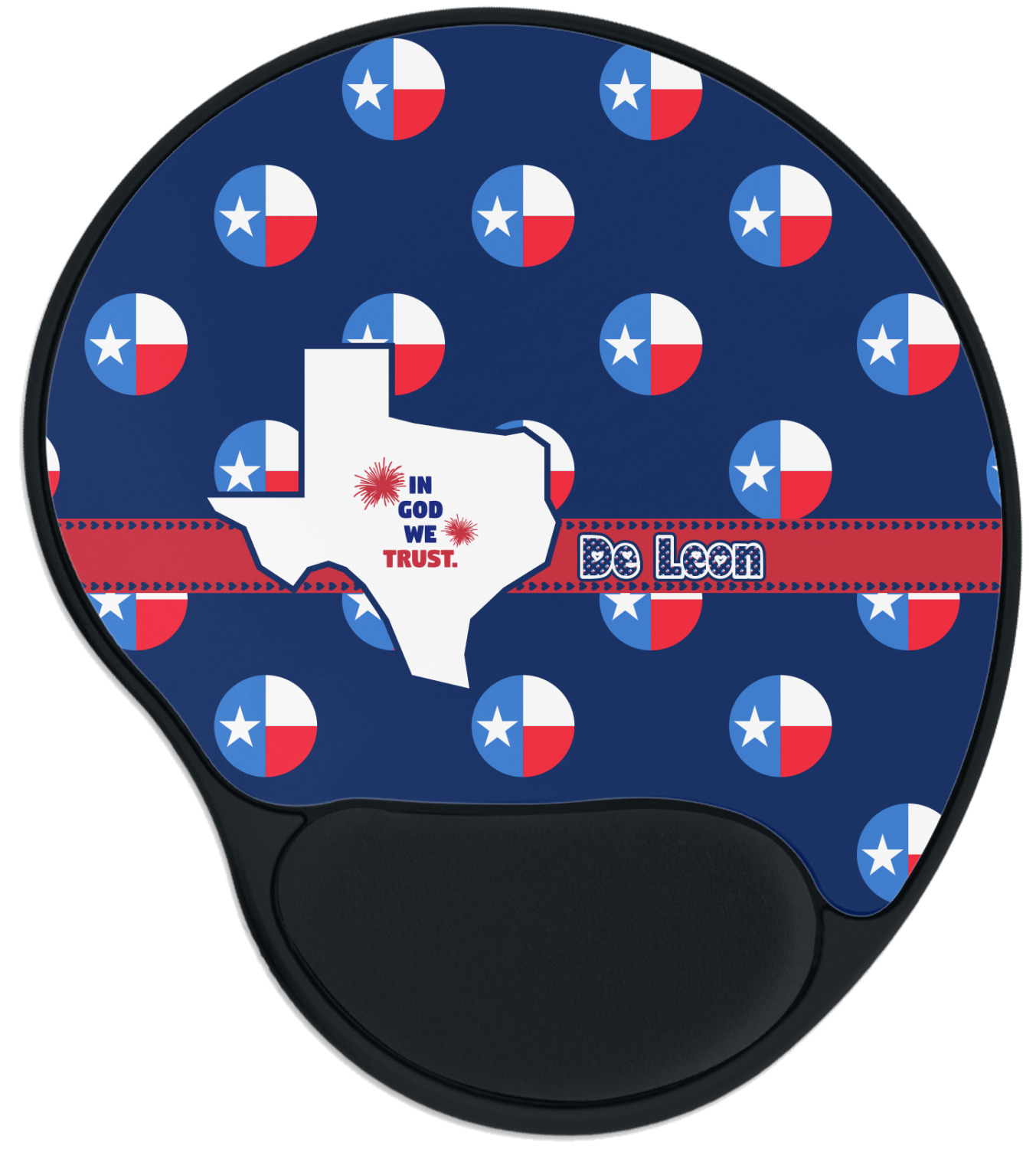 The top of these personalized mouse pads are made from a polyester, while the underside is plastic. The back of these mouse mats include rubber feet to prevent any slippage while in use. A padded wrist support, made from plush memory foam, occupies the bottom section of these computer mouse pads. Your customized design is printed onto the face of this mat, with the remaining sides and support piece colored in black. The mat itself is rounded and measures at 10.25" x 9.13".